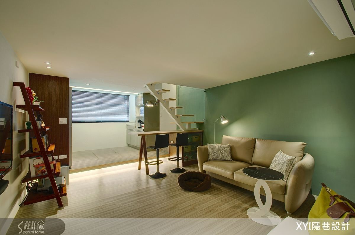 客廳最吸睛的,其實是色彩的表現,並以收藏畫作妝點,前衛而且時尚。以屋主喜愛的寶石綠最為搶鏡,像電視櫃、櫥櫃,以及窗簾的配色,再融入金與粉的點綴,恰如其分的比例,讓極具個性的色彩在沉穩中更顯跳脫。尤其是門拱旁的櫃體,一側中空嵌上小冰柱玻璃,讓客廳採光也讓透進玄關;另一側則是寶石綠櫃體加粉色單椅,安裝兩盞女主人最愛,外黑內金的造型投射燈,這裡是她喝咖啡、閱讀,可以發呆的角落。