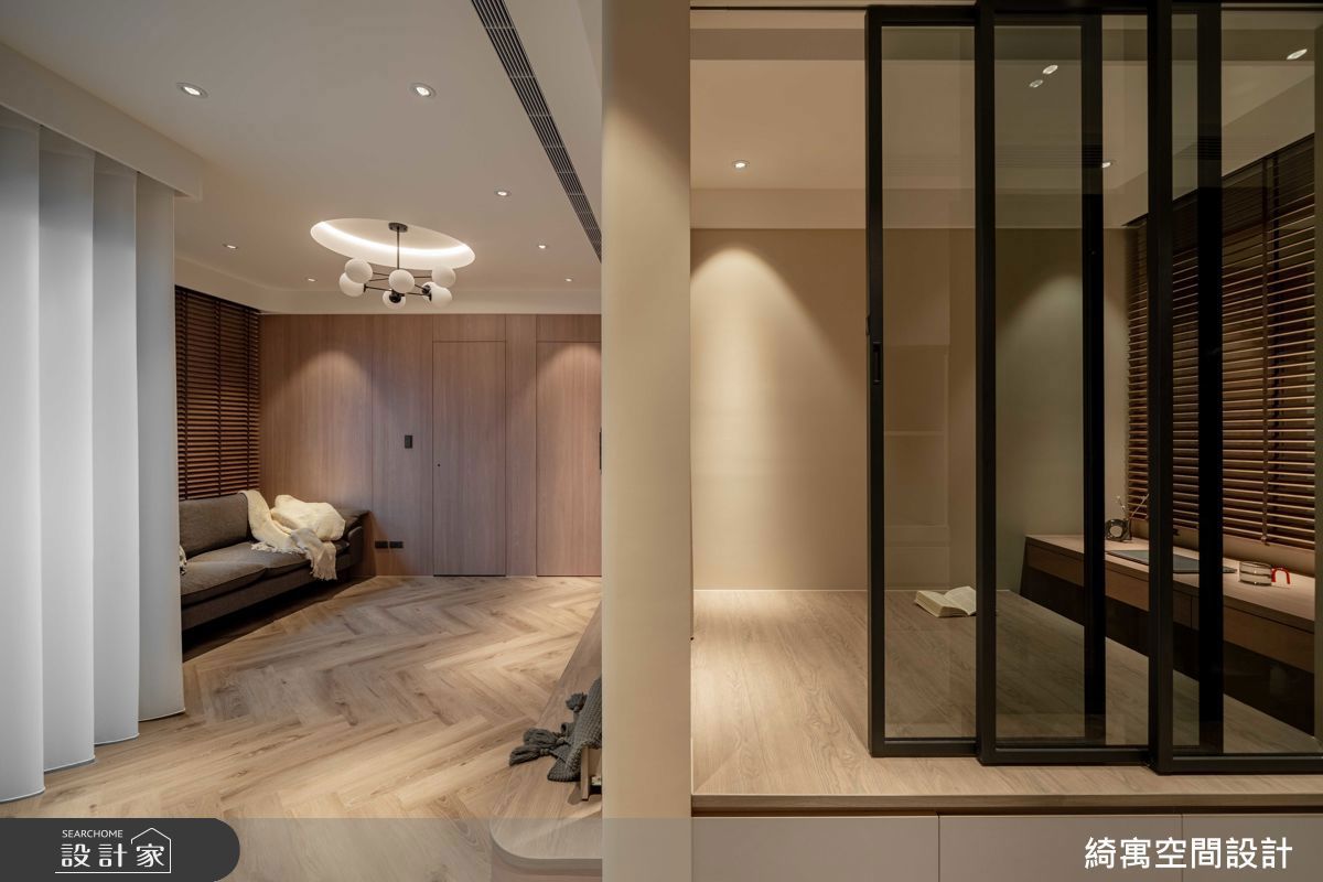 客廳電視牆保留大面積留白,採用矽藻土調節濕氣,且刻意不將收納做滿,局部挖空做出展示,形成具有層次變化的主牆表情,同時選配多色沙發、抱枕等帶出跳色變化,詮釋北歐風的清新質韻;客廳、餐廚區之間則瓦解界線,採以開放形式增進互動,並將餐廚整合在一區,賦予 L 型廚房動線,形塑俐落明亮的使用情境,而書房更呈現半開放型態,隨時可與餐廚、客廳開啟對話、交流無礙,一旁的展示牆更羅列著豐富藏書,收納量相當充裕;主臥,納入一座古樸的鐵件收納櫃,搭配著床頭色調,形成自然溫潤的底蘊,並將屋主私藏的茶具作為空間裝飾一部分,帶出起居領域的專屬個性!