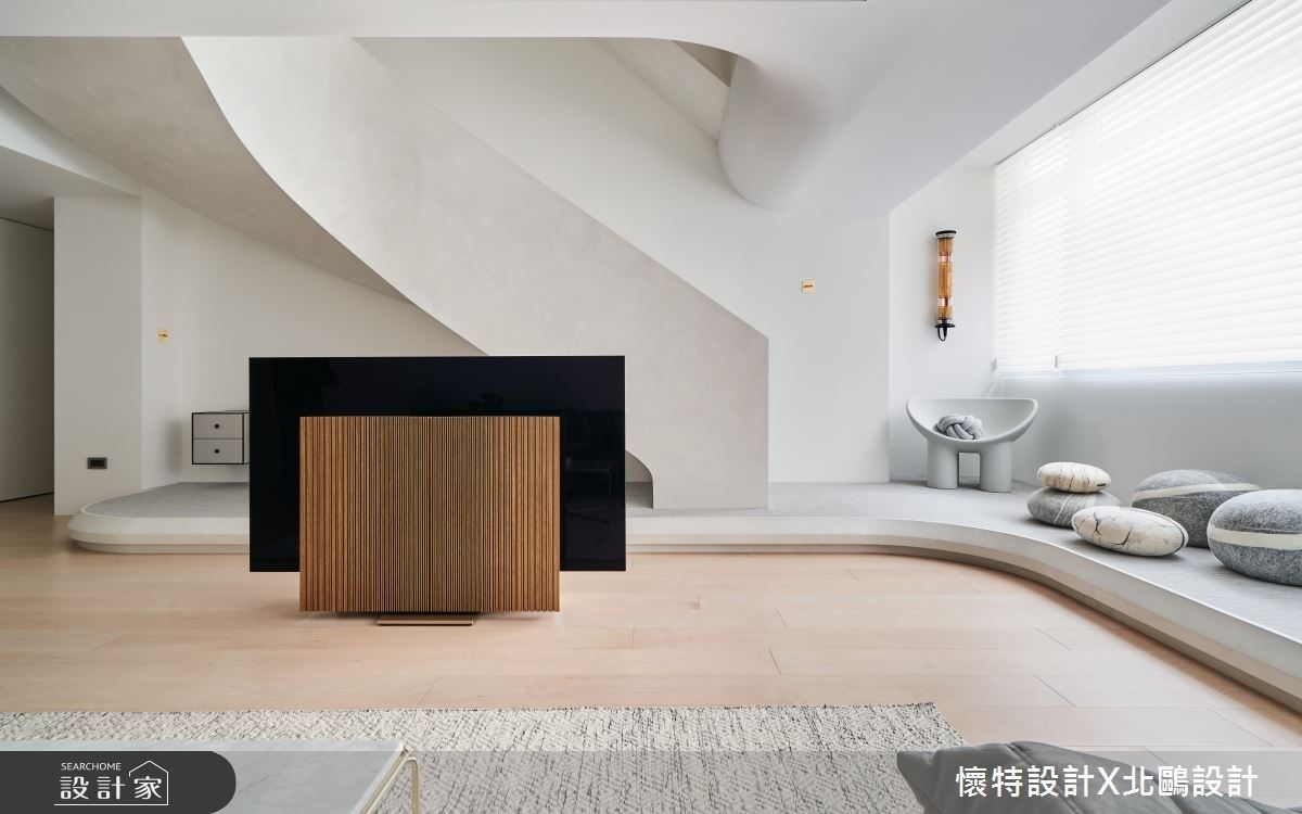 面臨原有空間裡樑柱結構、間距較小,以及室內樓梯位於樑柱交叉點的考驗,設計師特別利用獨立玄關的設計,階梯沿著壁面轉兩次彎、延伸向上,讓出更多空間給公領域。整體室內活用了許多豐富材質,像是鐵件、玻璃、木紋磚、霧面結晶鋼烤等,混搭不同特性的元素,創造出充滿活潑、趣味感的時尚工業風;客廳空間裡,牆面與天花板皆飾以仿清水模特殊漆,營造出工業風的自然粗曠,電視牆的側邊以馬賽克磚妝點,流露復古華麗之美,電視牆的上方則以漸層高度的展示層架點綴,結合展示機能更讓樸實的牆面增添變化。餐廚空間鄰近室內樓梯,以深色調為基底,透過廚房的開窗設計,讓光線走進室內,照亮烹調與用餐領域;餐桌的上方搭佐鏡面,且垂掛幾盞清透質感的玻璃吊燈,讓光線能夠持續蔓延;中島垂直銜接餐桌,與工作檯形成L形動線,廚具門板使用霧面黑結晶鋼烤,蘊含簡約深色系的非凡品味,替工業風注入嶄新風貌!