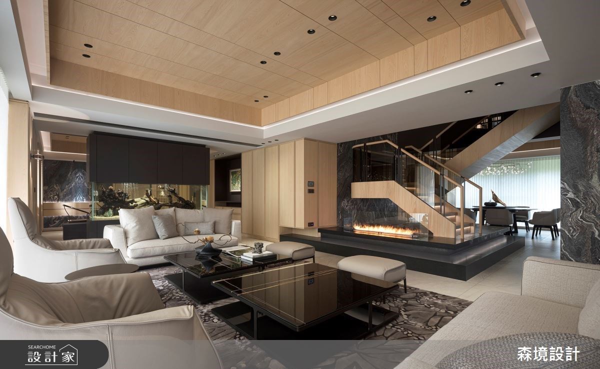 樓上規劃出佛堂與交誼廳,三面採光讓空間裡的人們沉浸在暖陽的溫度裡,黑色鐵件與柚木肌理相融,交織出寫實自然的生活況味;佛桌特別訂製出合宜尺寸,壁面舖陳金底黑字的心經,展現聖潔與莊嚴之心。