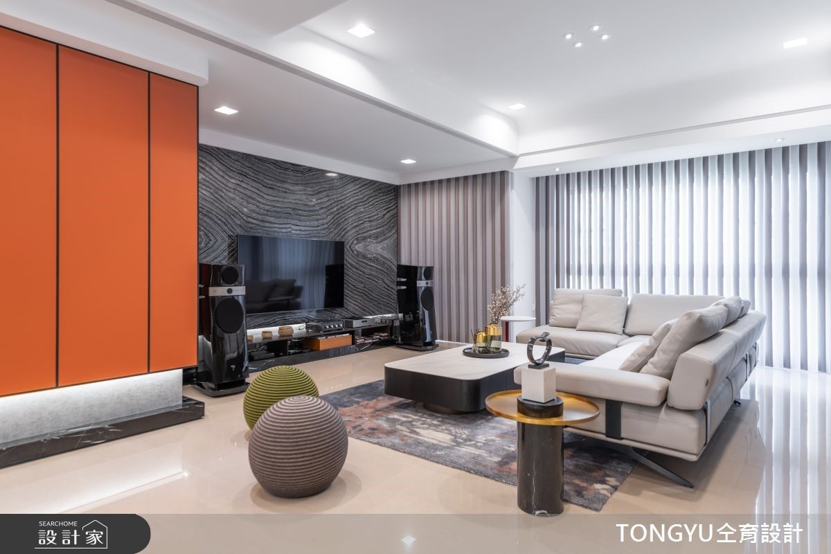 電視牆用大面積的石材,把電視、收納櫃嵌入其中,並用閃亮的金邊修飾,營造自然且有質感的居家氣息。