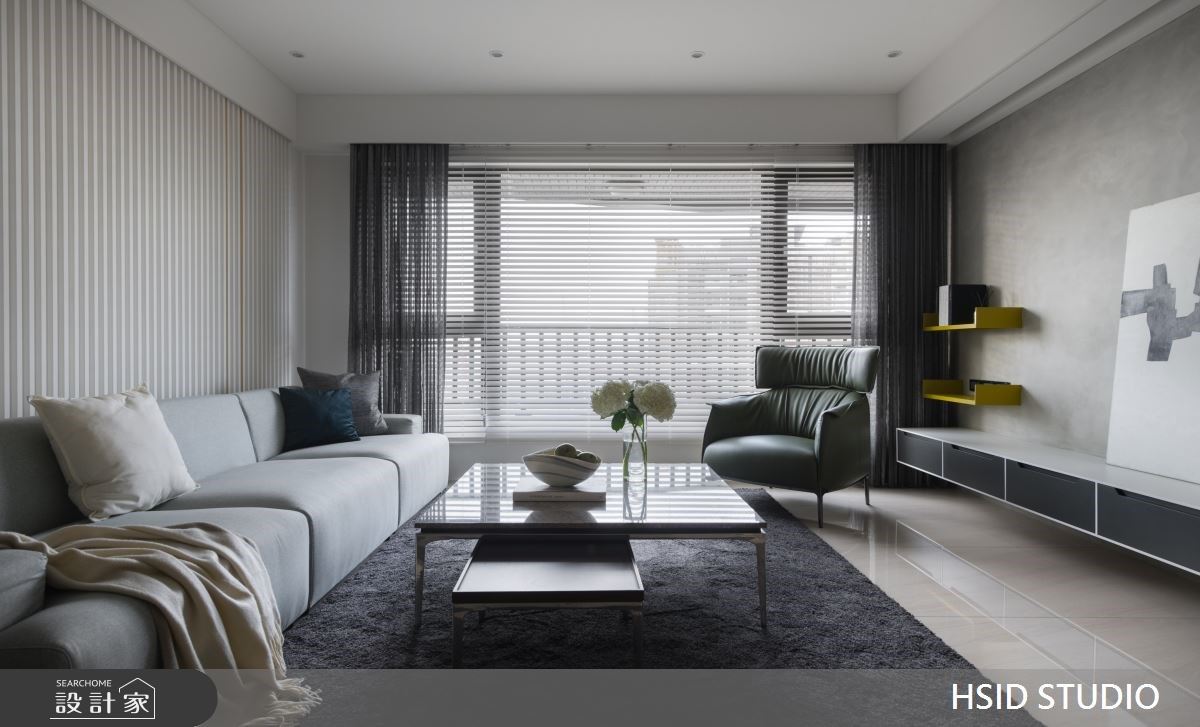 客廳的大理石紋替公領域定調,呈現質樸又高雅的起居氛圍;大尺度展示櫃後方則用珪藻土壁紙,延伸沉穩的灰色系,並能調節室內濕度。與客廳保持開放性的餐廳區域,木紋餐邊櫃鑲有一道金黃,在略黃燈光的襯托下,顯得溫暖又不失質感,同時讓用餐區不會因為採用大量石材裝飾,而過於單調且冰冷。