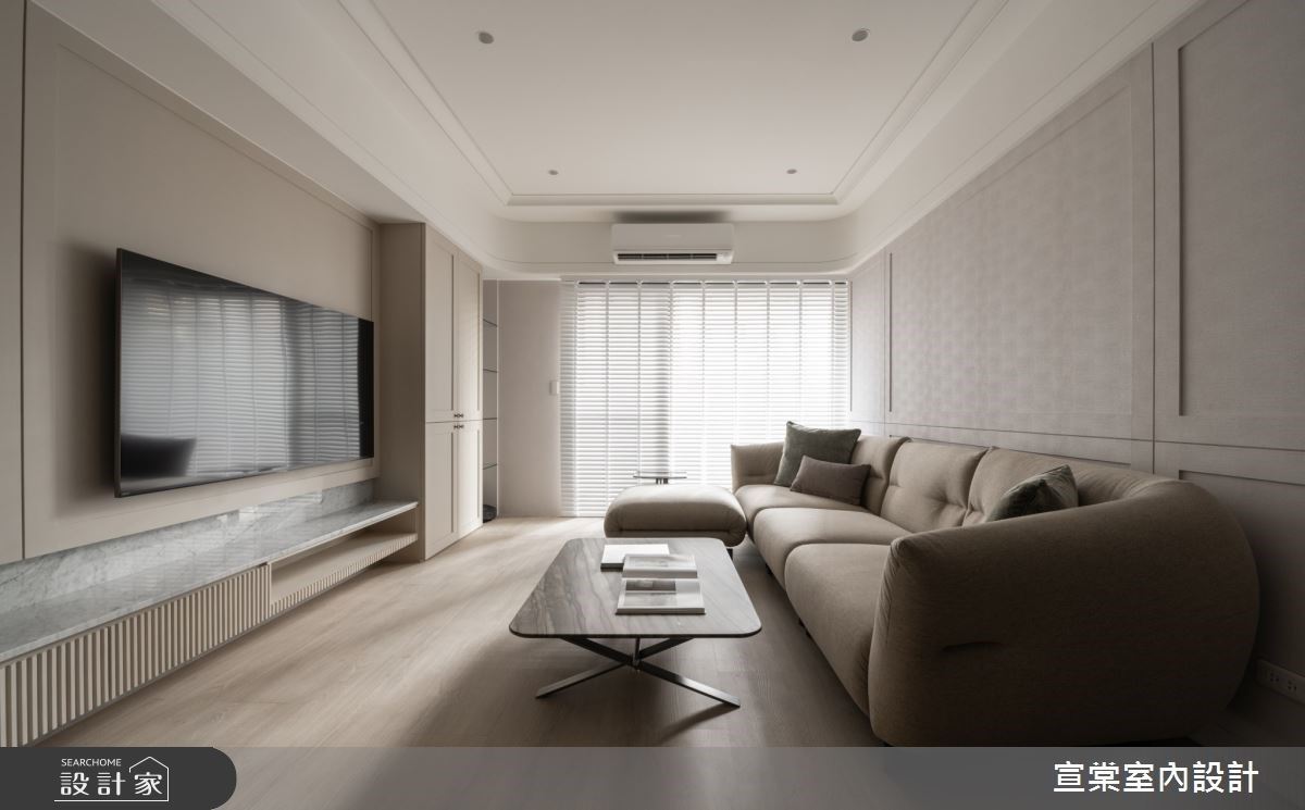 將電視牆拉寬,圍塑出玄關範圍,形成清晰的內外界定,並降低電視牆高度,讓客廳可與入口區域視線串聯、增添場域互動,達成採光的交流,而天花部分,則刻意加寬樑體造型,讓大樑不致顯得突兀,藉著立面與天花板的重塑,成功打開居家空間感,同時亦整合收納機能,安排儲藏室集中收納,避免櫃體的零碎置放,打造出開闊清爽的視野。