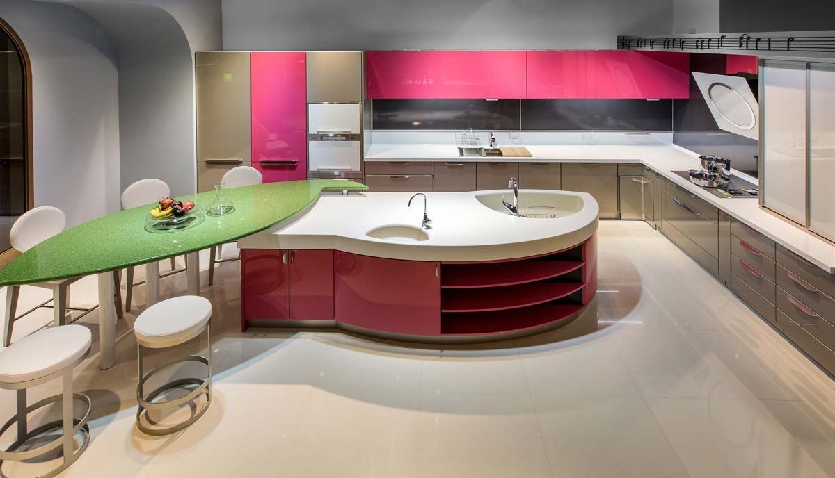 此案位於新北市的一處豪宅裡,為了滿足屋主喜歡多變、時尚特性,櫃體門片特別加寬,開闊氣度彰顯出非凡氣勢;視覺配色上更顯大膽,將男屋主強悍的個性轉化為藍色的門片設計,女屋主溫柔的性格,則凸顯在粉紅色的水槽,注入些許甜美元素。因屋主事業有成,考量圓融圓滿的人生格局,顛覆規矩方正的邊角,在中島以及廚具的側邊皆以圓弧收邊,這項設計特別展現工匠們超高的技術;而為了讓機能與美感進階提升,連收納髒汙的垃圾桶底部都結合滾輪,可融入櫃體造型、收整在工作檯下方,隨需求拉取使用。
