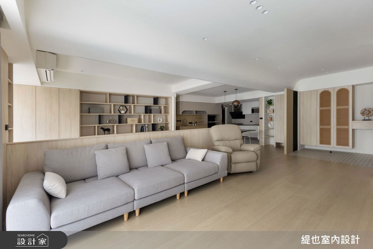 電視櫃一路延伸至窗邊,開展出臥榻區塊,在化解樑柱壓力的同時,也在底部暗藏收納空間,組成淡雅的休憩小天地。