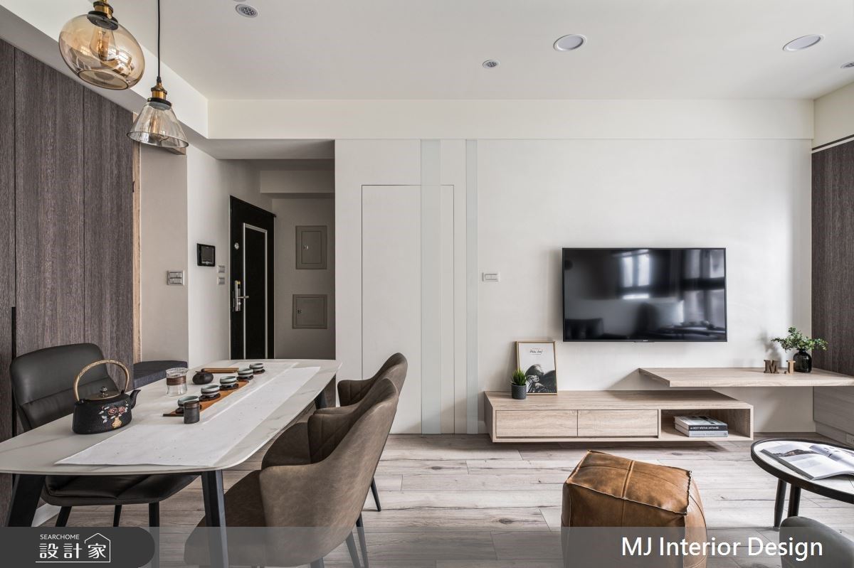 玄關區走道擺置大面明鏡、金屬裝飾品,作為優雅生活開端,並選用與室內相同色系的木材高櫃,讓視線順勢入內,而足夠的櫃體容量,滿足了衣帽、鞋子的收納需求;客廳規劃根據屋主習慣,捨棄了電視牆設定,將會客長桌鋪排於沙發後方,拉寬視覺界線,讓閱覽、交誼、影視三用途,舒服進行;廚房結合吧檯的設計,作為品酒、燭光晚餐的最佳場地,只有夫妻兩人的時光,移駕此區氣氛加乘;臥房空間同樣予以簡約色調,鋪排紓壓氛圍,並利用天花線版的間接光源,帶出溫潤氣息。
