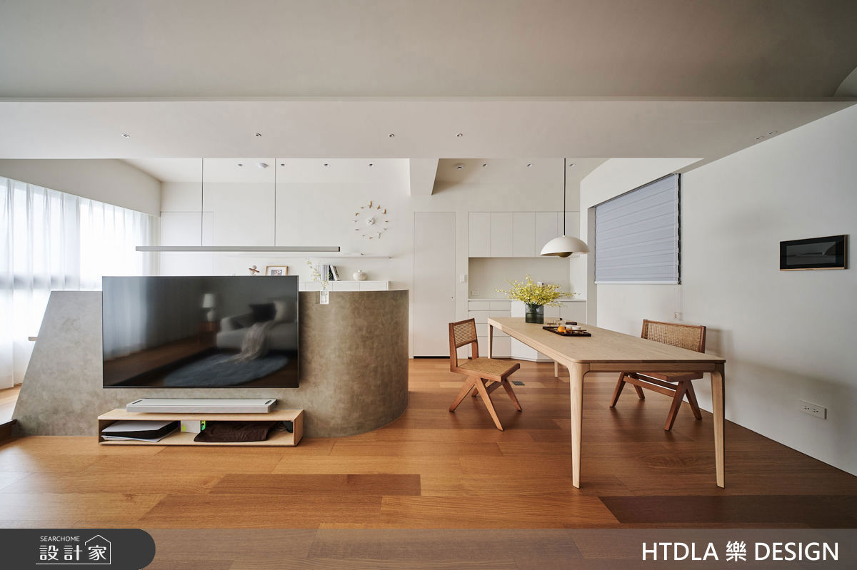 空間採用輕盈灰色為底,並保留對外的迎光面、導入明亮採光,鋪述公共空間的恢弘質感,並布置跳色的家具、抱枕,打造俐落卻鮮明的主題式色調,主牆則擺放畫作聚焦,替居家注入藝術色彩,形塑優雅的現代風表情;且透過開放式格局配置,串聯客廳、餐廳之間的關係,以一道展示收納矮櫃做中介界定,劃出順暢、不受阻礙的交流情境;而餐廳的後方,則引用鐵件、灰玻等規畫半開放式的隔屏,既保有書房的適度隱私,也維持與公共廳區的互動關係,而灰色立面則與電視主牆相互對話,串起一貫的大器格調!