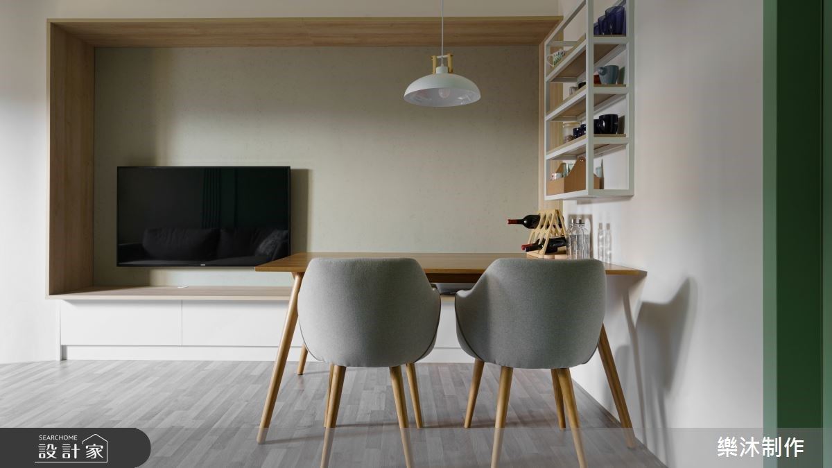 玄關長廊壁面,以整面純白收納櫃俐落視覺,並藉由地坪材質的轉換,分野落塵區。入門視線頂端以玻璃屏風,阻擋了開門穿堂的疑慮,而看似隨意擺置的簡約三層收納架,便利進、出門穿戴需求外,巧讓屋主的衣物,變身獨一無二的裝飾品。客廳 L 型湖水藍沙發、清水模質感電視牆相互搭佐,散發的慵懶與樸實氣質,為午後的悠閒時光傾注更多紓壓氛圍。平行於客廳的用餐區,以客製收納櫃作為餐廳主角,上層櫃正中央的屏除門片,改以展示設計收納珍藏美酒,下方則挖空作為餐椅、臥榻區,一櫃多用的創意設計,為生活打造趣味、實用機能。