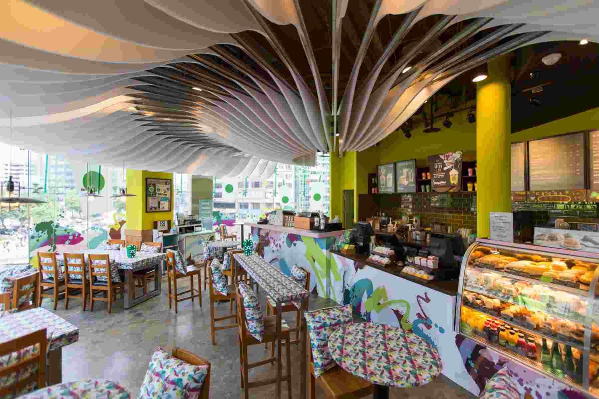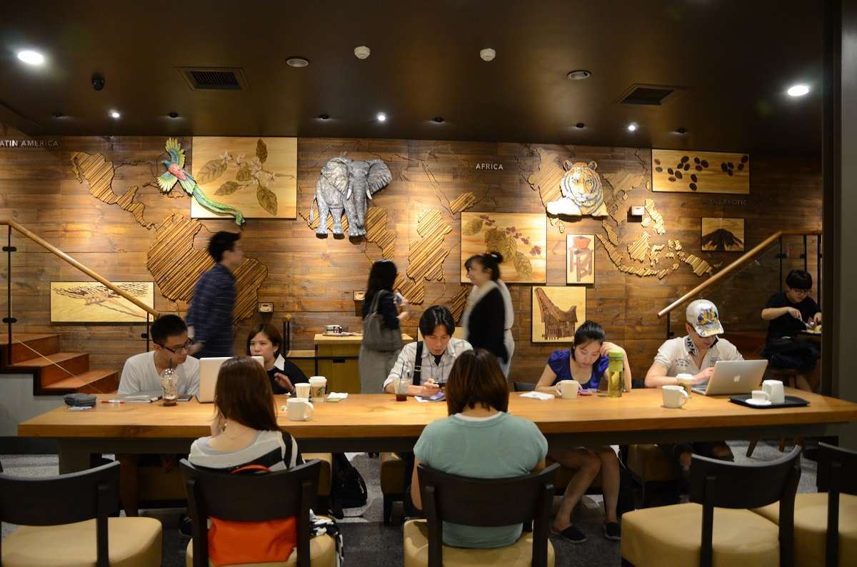 內裝設計上,花蓮洄瀾門市以保持貨櫃原始風貌為主,僅在部分牆面裝飾木皮板亦運用了在地阿美族原住民的鮮明色彩點綴,展現了星巴克深耕在地