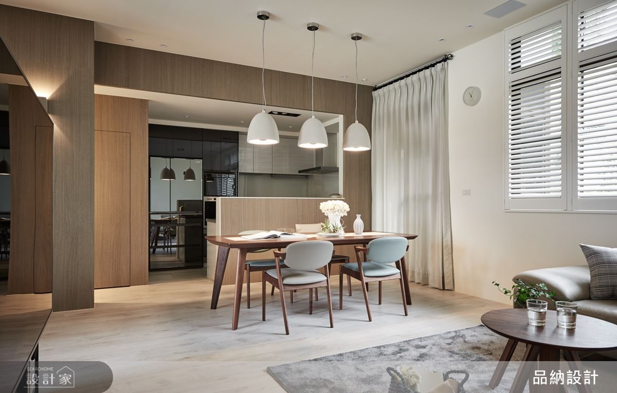 居住的空間不適合添加過多色彩,會導致視覺上的雜亂,反而無法安定心神。豐聚設計運用深淺灰階色調與純白色為基底,再利用各種漸層藍搭配家俱軟件,彩度降低,回歸純粹、乾淨的視覺感,再襯托出不同層次的空間表情。客廳 L 型沙發、單椅,以及餐廳餐椅的各種藍,陽光漫入室內,在一室的灰、白、木質色調之中,配色簡單饒富質感,勾勒出溫暖安定的寧靜感受,亦能活絡空間表情。