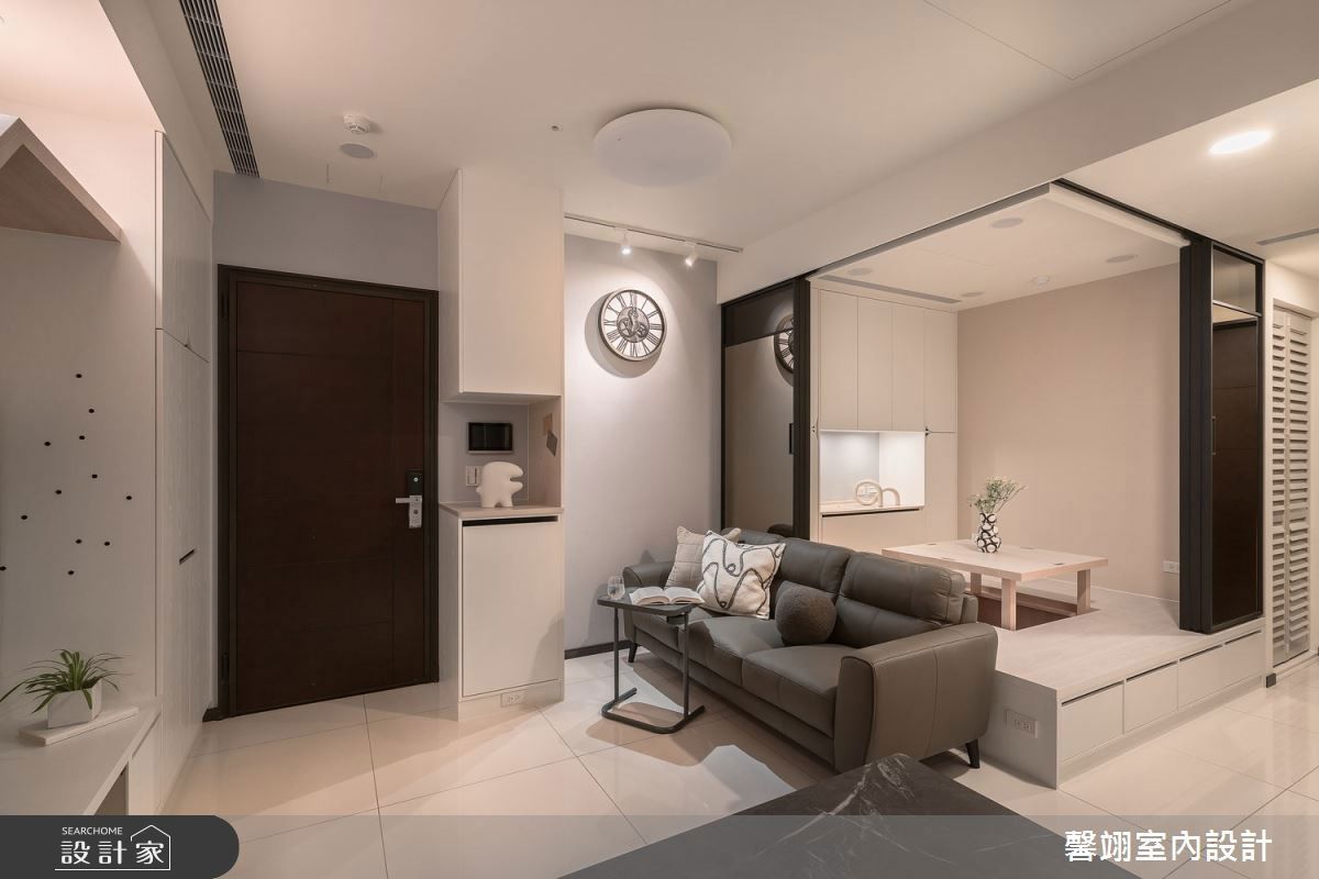 玄關,以金色單椅及金色立燈,呈現劇場般的視覺場景,帶出恰到好處的低奢質感,並安排紅酒櫃量體作為兼具機能與動線導引,以灰玻璃圍塑輕盈的通透感,搭配地面帶狀燈光的延伸,營造出具層次感的光影趣味;全室以米白色作為基底打底,並統整空間線條,藉由工整的分割線隱化門片及收納櫃,呈現立面的俐落感,廳區則以沙發為界、分為前後區塊,前段作為為家人的起居空間,後段則做為適合閱讀、品酒、聊天的多功能場域;書房,打造多功能臥榻,並加入皮革與波斯地毯,營造窗光前的美好休閒時刻;私領域內,承襲著箭形拼花的木地板設計,展現純淨溫潤的氛圍,且同樣將寢臥、衣帽、收納等機能隱於牆面,顯出純粹的空間感!