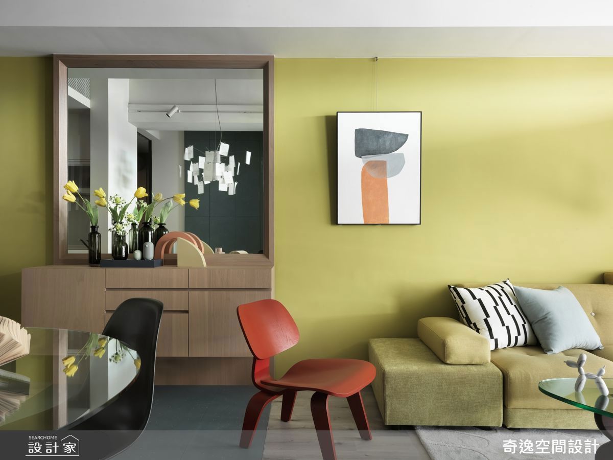 運用建築視角,讓多色的炫麗光帶遊走室內,同時打造幾處精品展示空間,讓屋主夫妻收藏的時尚物件得以陳列、擺設,家彷彿穿上了新潮的衣裝,隨時演繹時尚姿態。