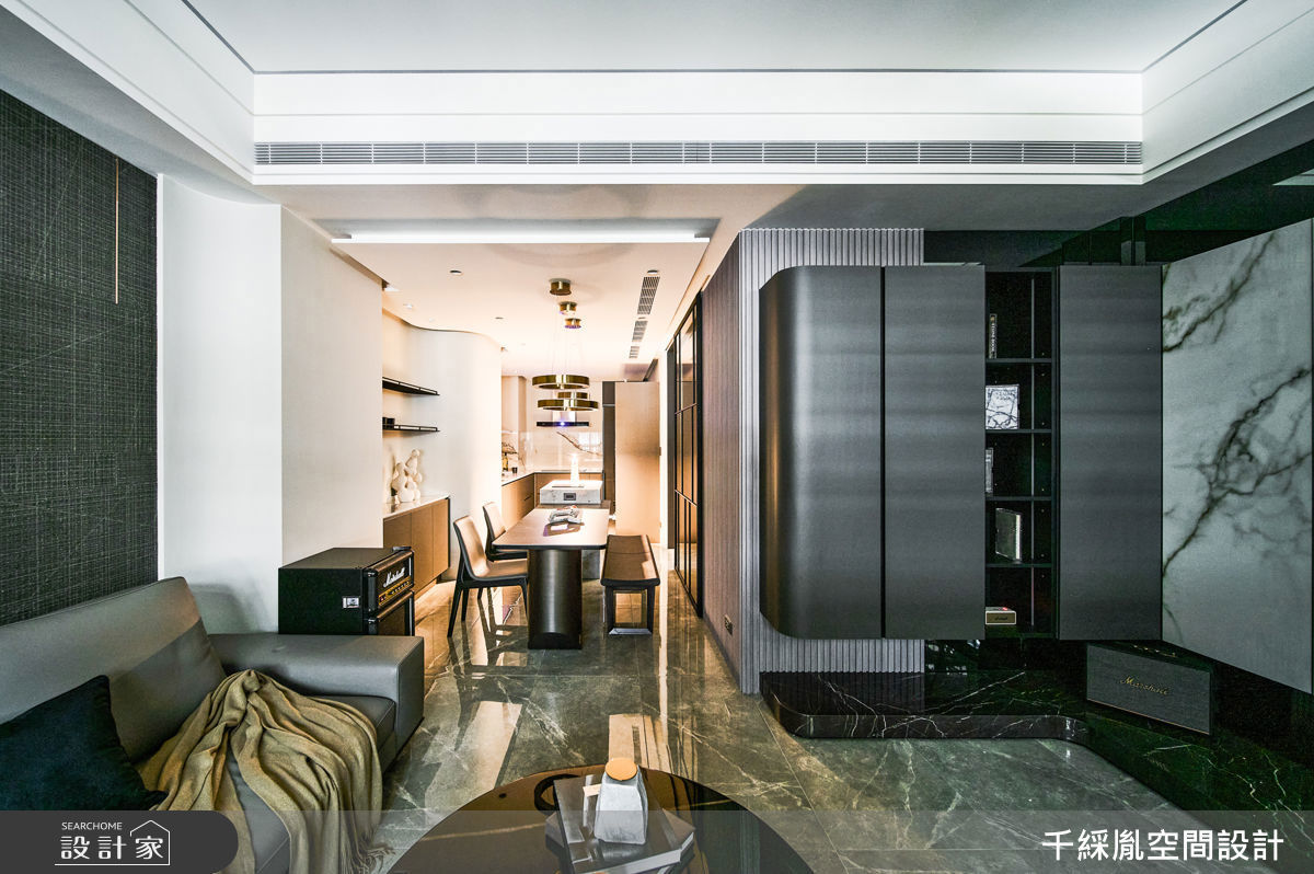 玄關鞋櫃以開放式設計呈現,隨著玻璃層板的搭建下,搭佐智慧光帶,如精品般的陳列出每雙鞋子,展現獨特的單品魅力。公領域裡,天花板以黑色線型勾勒漸層視覺,地坪鋪設大面積的銀狐磚,伴隨日光的映照下,掀起撩動人心的韻律美感,形塑軒昂大器之感;呼應新潮的生活態度、破除制式的牆體設計,電視牆僅簡單立著、面向沙發區,電視背面空間則做為屋主的時尚收藏區,透過金屬、光帶、鏡面打造精品展示端景,以不鏽鋼、鍍鈦金屬等異材質構築出國際精品般的櫥窗藝術,同時轉化為居家空間的視覺端景;沙發背牆則運用特殊漆與灰鏡,創造出不對稱的折線美學,隨著光線折射,替空間注入流動的韻律感。