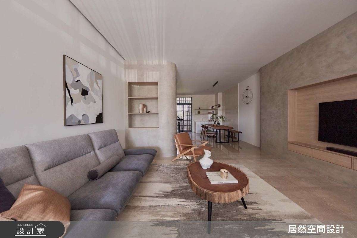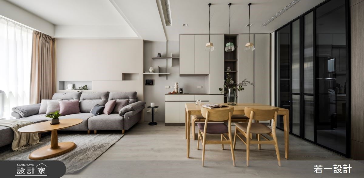 明亮的日光從落地窗走進室內,照亮公領域的設計細節,亮綠色調的沙發背牆安排,加上動物角的造型裝飾,營造出活潑、趣味感;電視牆以磁磚鋪設,亮面的材質特性成功提升視覺美感,上方結合收納櫃體,簡約的造型規劃呼應北歐風的樸實自然,且強化家的實用機能;臨窗巧遇畸零空間,順勢打造成臥榻區,成了父母與小孩日常的休閒區;利用木作包覆L型樑柱,界定出客廳與餐廚領域,大量以白與木紋為基底下,藉由跳色家具與風格家飾的點綴,形塑一抹活潑的韻律感。