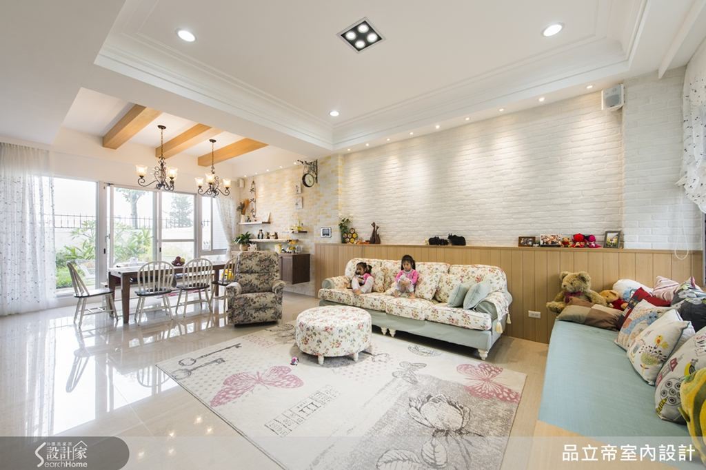 由於一家四口對於居家風格各有偏好,經過了一場家庭會議,決定公共空間以女主人喜歡的鄉村風為主調,設計師保留鄉村設計的純樸氣質,運用原木、圓弧曲線等經典素材,強調整體風格調性,並在開放空間的架構下,利用屋頂木樑的線條變化來界定客餐廳場域,保持視覺通透性。另外,紅磚牆與壁爐是鄉村風的重要指標元素,設計師將其至於公領域中央,兼具電視櫃與紅酒櫃的雙面設計,進一步區分兩側的空間屬性,而煙囪型的造型設計,則削減了紅磚量體易造成的視覺壓迫,加深農趣古樸的生活感。