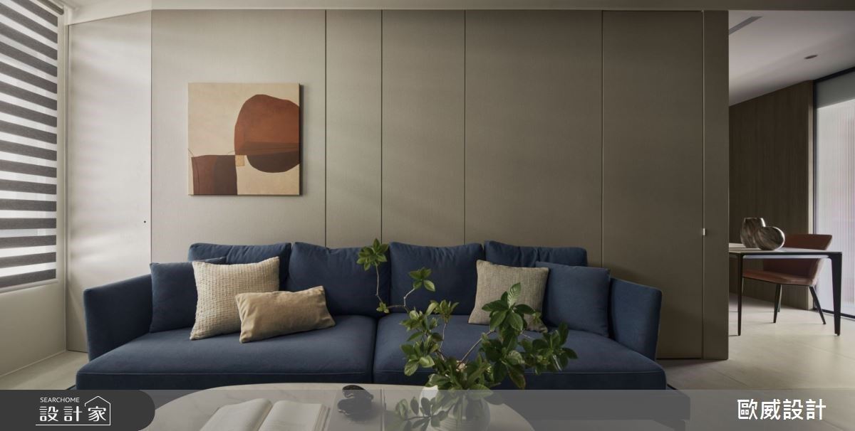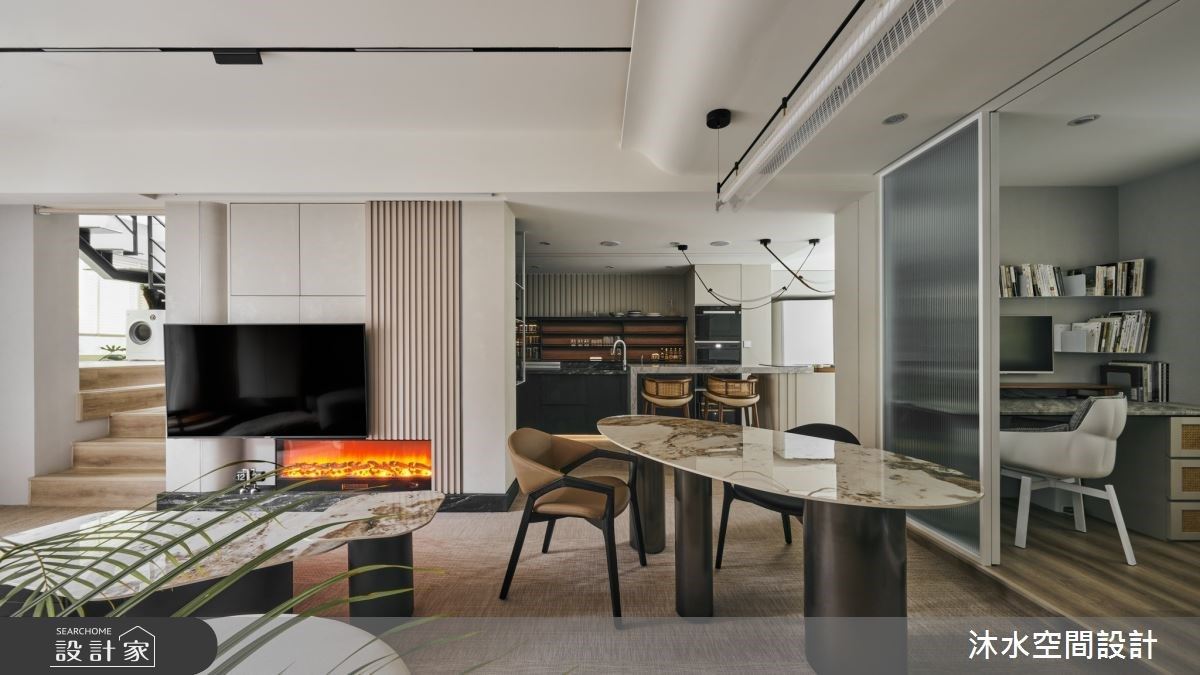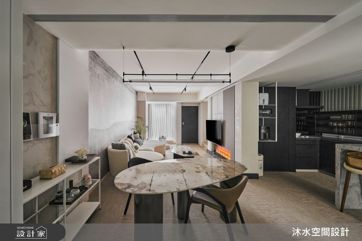 整體空間以開放格局為主,客廳天花板以黑色襯大樑周圍,彰顯挑高氣度;電視牆以白色基調的大理石打造,表面呈現的紋理流露出優雅氣息,白色的沙發背牆上懸掛一幅線條與色彩簡單的畫作,挹注高雅的人文美學色彩;電視牆的左側以展示開放櫃界定出客廳與餐廚領域,銜接一整面備餐櫃,上方的櫃體特別置頂設計,讓視覺更顯整潔、開闊,中央貼附鏡面質感,映照出室內空間的情境,視覺更為延伸、放大,中島則置於櫃體中央,拉出內外領域,用餐與料理的動線;一道玻璃拉門區隔出廚房領域,穿透的材質特性讓光能夠流淌入室,成功提升料理空間的視覺亮度,也讓領域間有所互動、交流。