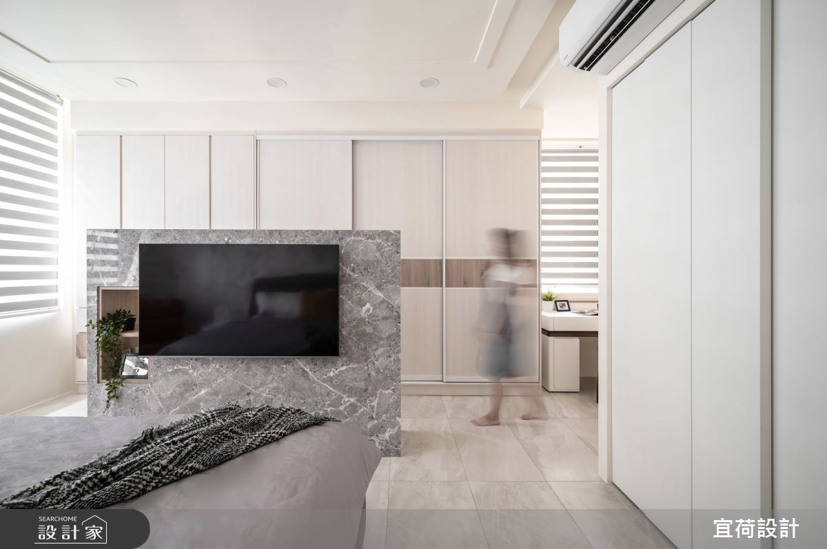 臥室空間裡延伸公領域的風格,以白色為基底,讓木紋襯出空間的溫馨氣息,搭佐大量的收納櫃,滿足屋主生活的實用機能。