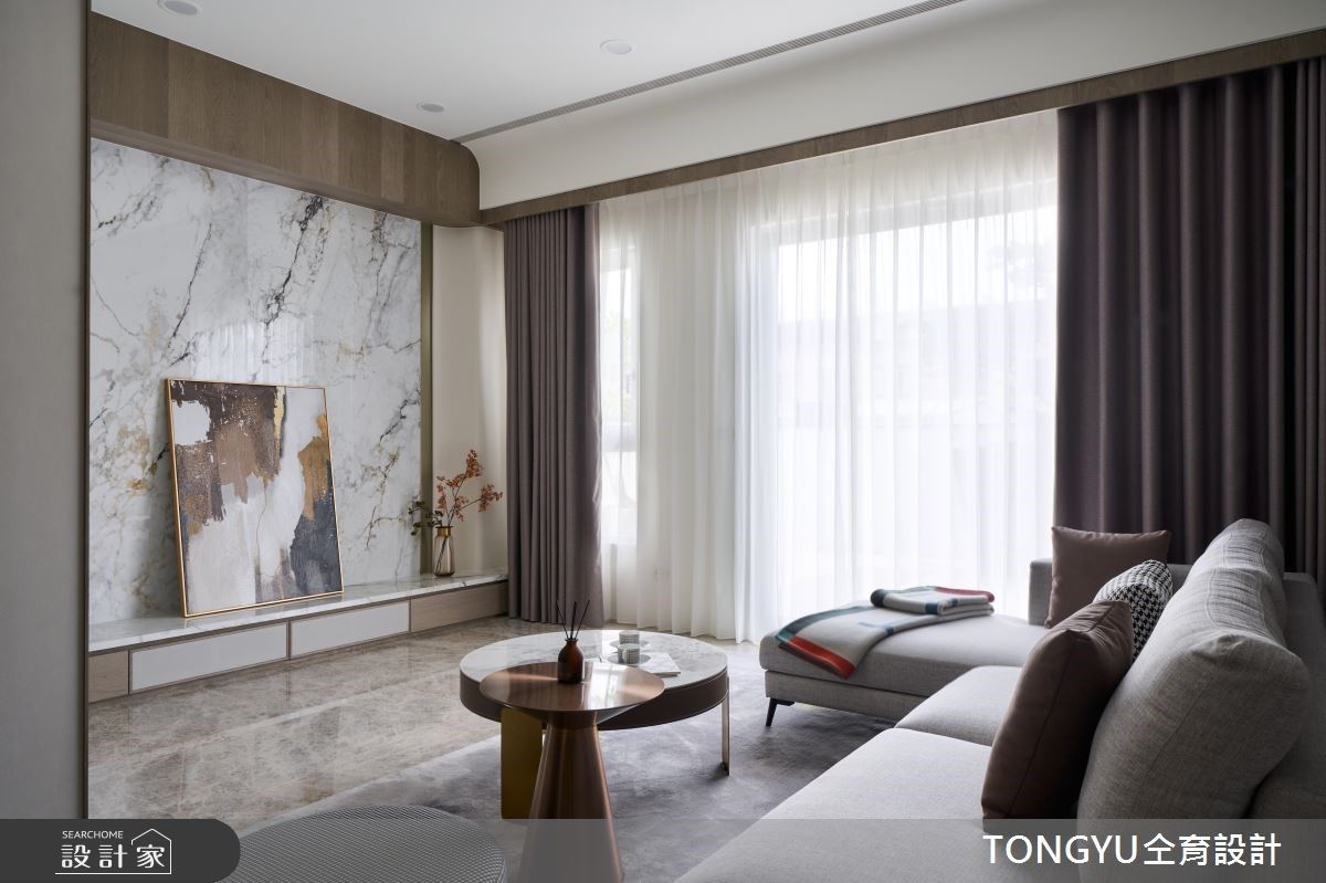 敞開大門,映入眼簾的玄關端景,由鍍鈦材質與大理石交織而成,細膩幾何主牆開啟震撼與優雅並俱的視覺饗宴,再透過兩側雙走道設計,創造開放而通透的寬敞視野。客廳區擁有絕佳高度優勢,帶有金邊細節的大理石牆延伸至挑高天花,一旁金屬材質的樓梯流線,打造氣勢磅礡的會客空間,而布面沙發及溫柔暖光,保留休閒生活氣息。坐落於玄關端景牆後方的用餐空間,選擇以圓桌作為凝聚情感的象徵,配合兩旁整齊格局設計,營造置於九宮格中心意象。二樓規劃為臥房休息區與書房空間,主臥在九宮格配置中佔有四格空間,寬敞幅度利用自由旋轉門片設計結合書房設計,能隨時應變空間機能,變換兩區塊光感與造型。