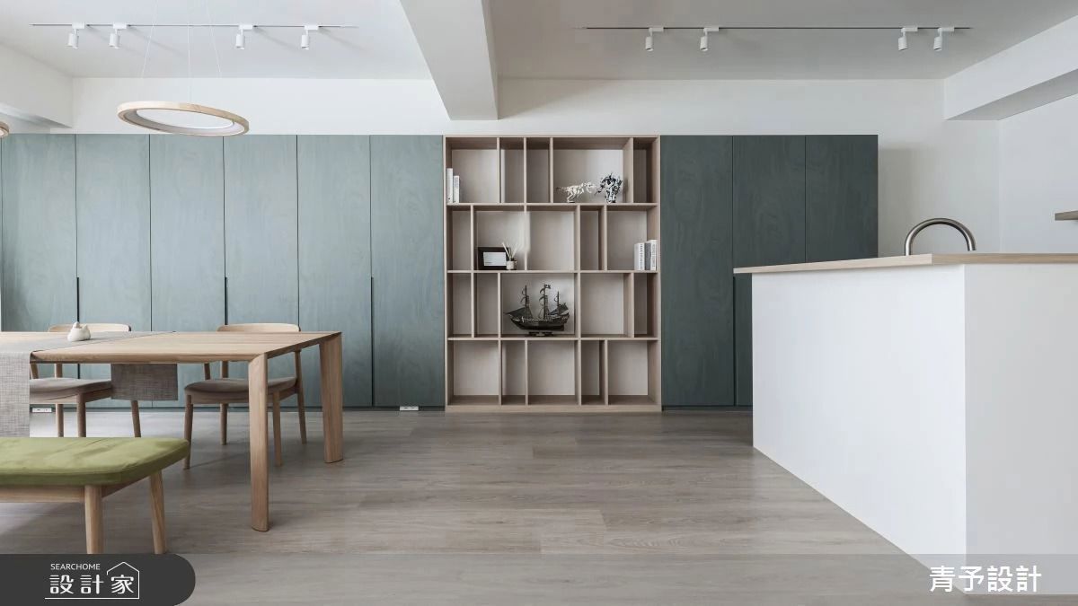 玄關廊道透過大幅藝術創作掛畫,營造藝廊空間氛圍,轉個彎,抬個頭,隨處可見的展示設定,展現藝術即生活理念;立面現代風幾何線條層次排列,呼應時而人字拼排、時而橫、時而豎的木地板設計,型塑層次分明的立體視覺;空間成為自由意念的具體化身,開朗格局因勢而生;用餐區則透過地坪材質的變化轉換場域機能,依循 L 型廚房格局,安排長型餐桌,梳理舒心生活動線;私領域予以大地色系,襯托寬闊臥房領域,並安排視聽機能、雙洗手台及放鬆浴缸設定,從裡到外完整照顧屋主生活享受。