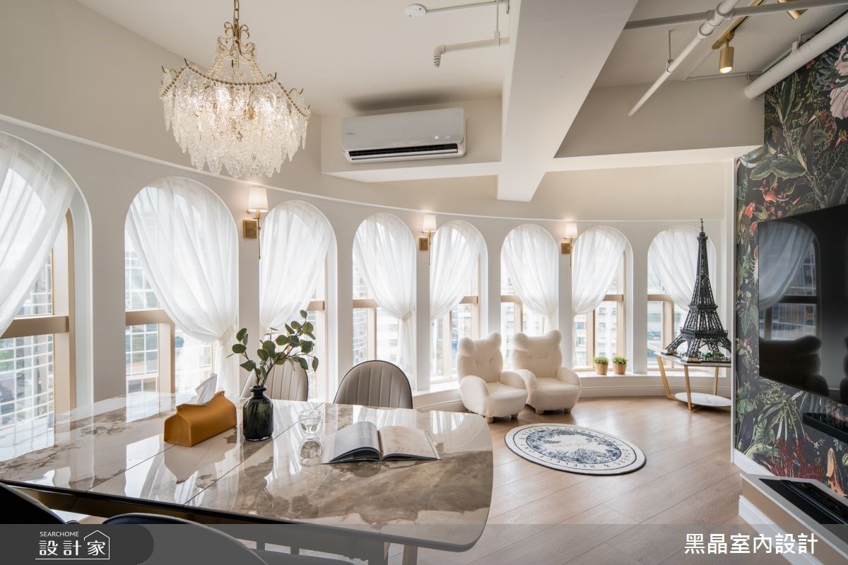 設計師援引有如宮廷般的高貴氣場,但透過淺色系的設定,以霧金、白色作為妝點、減輕了空間壓迫,展現輕盈而奢華的豪宅視野!