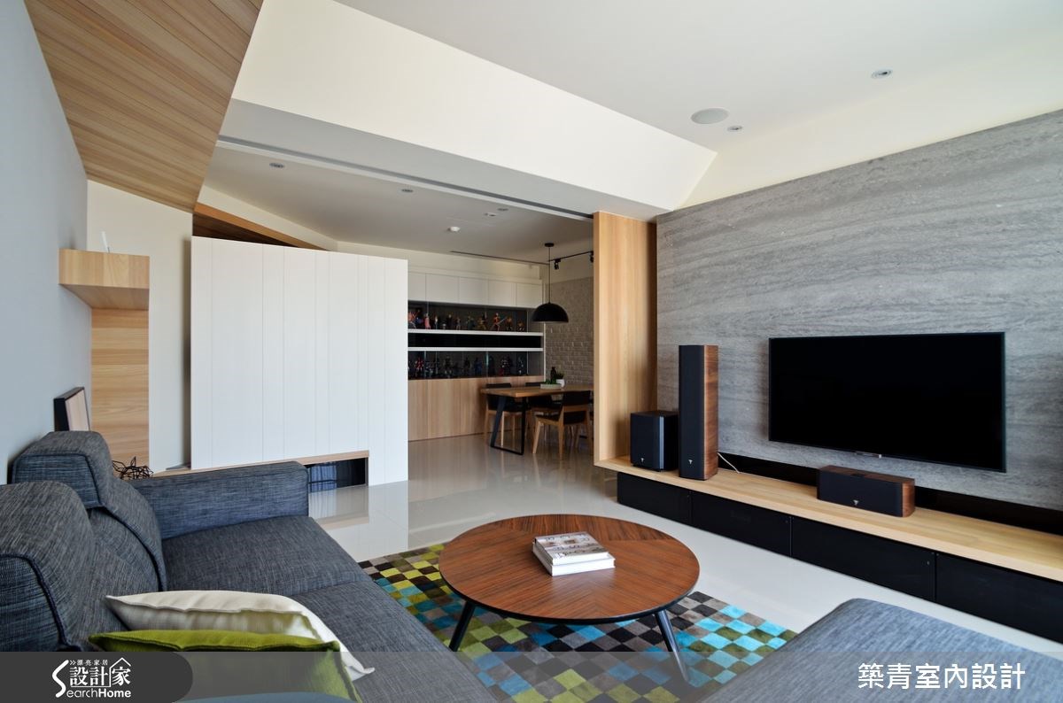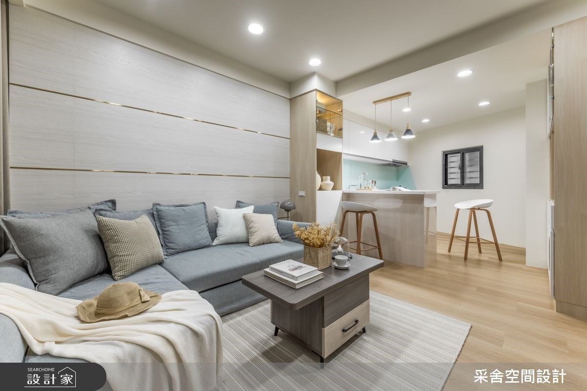 客廳灰色系電視主牆,奠定了整室好氣質,與門面的公爵藍、低奢裝飾物件相映成趣,巧妙用古典元素勾勒備受尊榮的居家氣氛。開放的廚房設計,利用小中島串接兩場域機能,同時身兼兩人生活的小用餐區;而花磚拼貼除了易清潔,也替空間中的每道牆型塑獨特端景面。主臥房門面用上百葉窗意象,獨具巧思的設定,放大公、私領域範圍,也營造出通透感十足的光感居家。