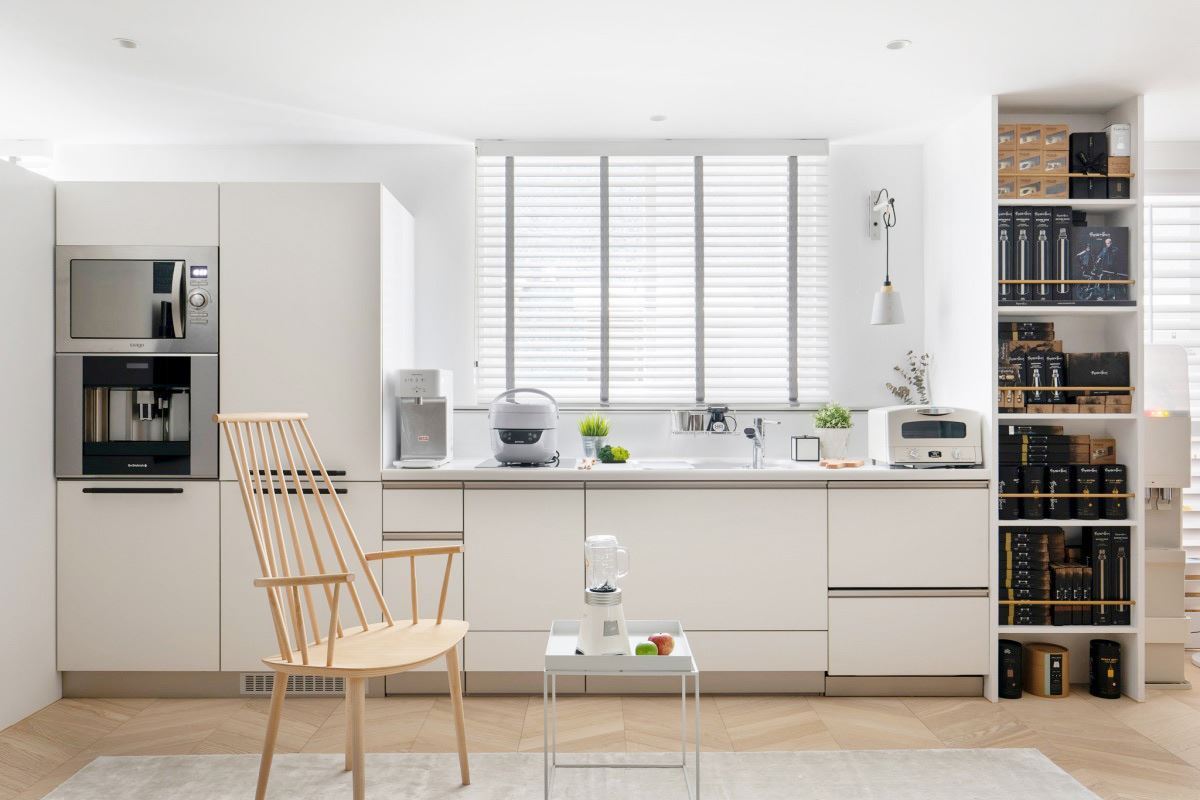 居家雜誌的廚房跟一般家裡廚房的最大差別,在於它們都運用嵌入式家電櫃,把烤箱、微波爐、電鍋、冰箱等各種家電通通收納乾淨,但如果要規劃嵌入式櫃體的話,最好要先於裝修前就構思完整,預留好散熱空間、丈量好家電尺寸,才不會到時候視覺參差不齊,還要再費一次工夫重新裝修,得不償失。