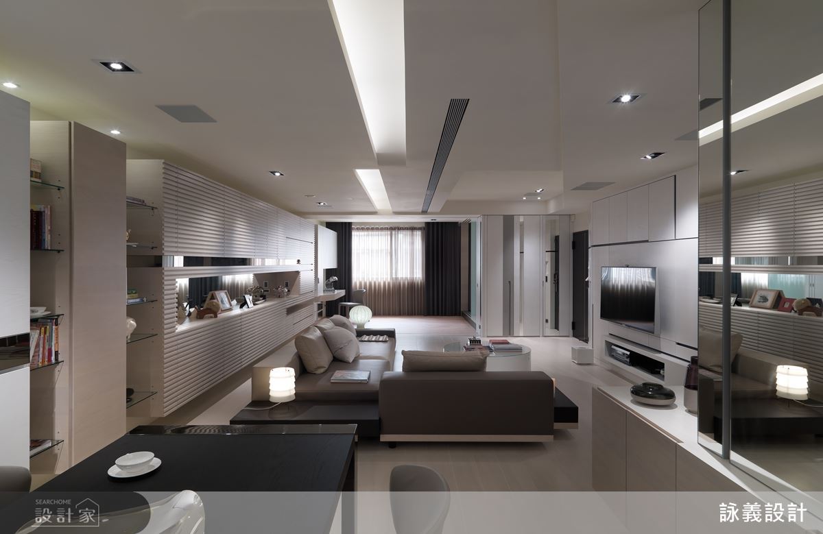 與平常會把主機櫃安排在電視牆的思考不同,設計師為了保持牆面的乾淨,以及動線的順暢,所以將管線隱藏於天花板中,一路拉到白色沙發旁的矮櫃,兼容機能與美感。主臥收納則規劃成更衣室,給人充足的機能性;小孩房的衣櫃採用橫向的掛衣方式,讓小空間能夠容納更多的衣物;而兩張床舖也都是上掀或側掀的設計,收藏各類雜物,將空間功能發揮到最大。