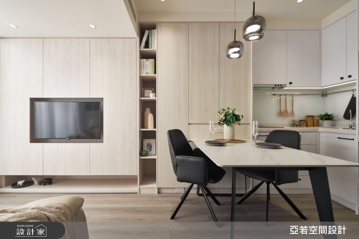 光是此空間的主角,所以設計師在規劃空間時,特別在木作和大理石施作時,預留硬式燈條的溝槽,當指尖按下開關,起始於圓形燈光的光束順著牆壁、天花板延伸至沙發背牆,化作直線、斜線跟檯燈造型的照明,使白色與木質為主視覺的素雅居家,能夠擁有不一樣的變化,擺脫一般對於室內照明的想像。