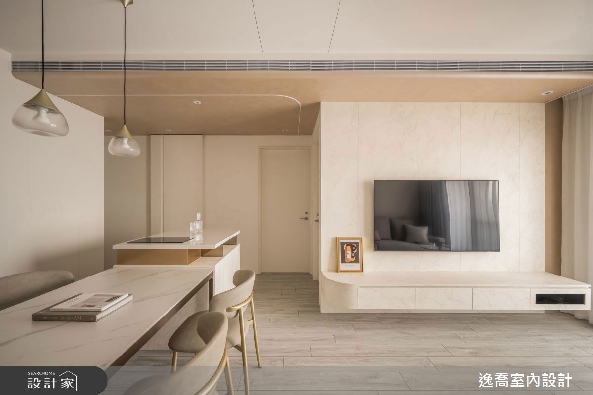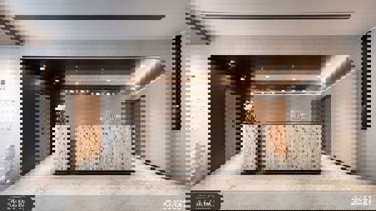 跳脫一般以鍍鈦、玻璃為主的現代風住宅,40坪大的新成屋內以「原木」與「石材」堆砌出空間調性,公共區域的開放式設計中,隨著動線自然變換材質,由玄關的黑色大理石磁磚揭開序曲,進入室內地坪轉換成沈穩的原木,與天花板上下交織營造山林的意境。餐廚區域的背景轉換為薄磚包覆收納機能,沙發背牆的木格柵與鐵件弱化了收納櫃的存在感卻不減實用性,並與木百葉相互呼應。轉個視角,綿延的石皮流砂在電視牆緩緩展開,自然呈現的紋理將視覺焦點凝聚匯集,安置於沙發後方的書房空間,讓居住者能安靜端詳此宅的愜意。