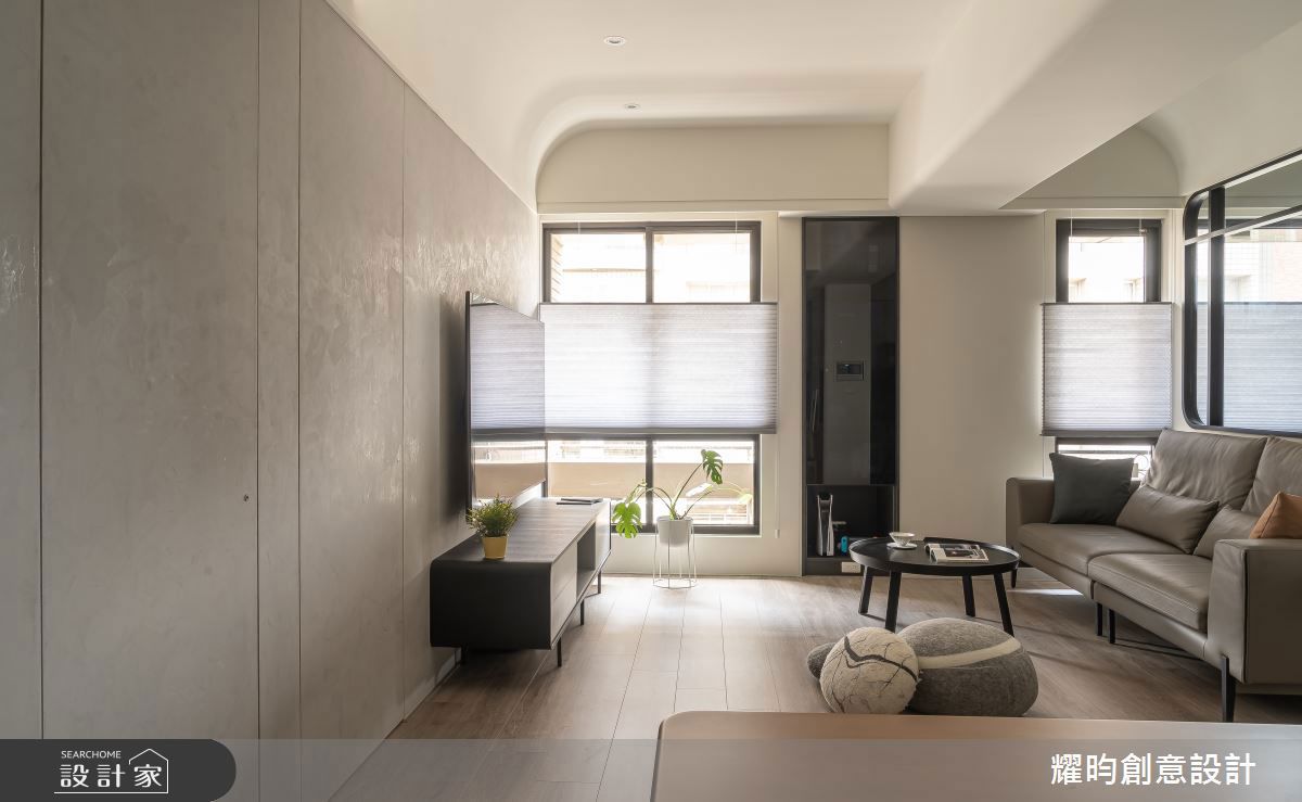 開放的公領域搭襯落地窗外的良好採光,無限延展空間寬敞度;純白無瑕的電視牆不自覺放大觀影視線,簡練的燈具佐特殊選色的小茶几,則替客廳增添精緻氣氛。垂直於沙發後方的餐桌設計,串接中島吧檯與一字型開放廚房平行安排,烹飪動線順手便利,用餐範圍也得以延伸,搭配極簡白色系的廚具,奠定整齊簡練的生活風格。