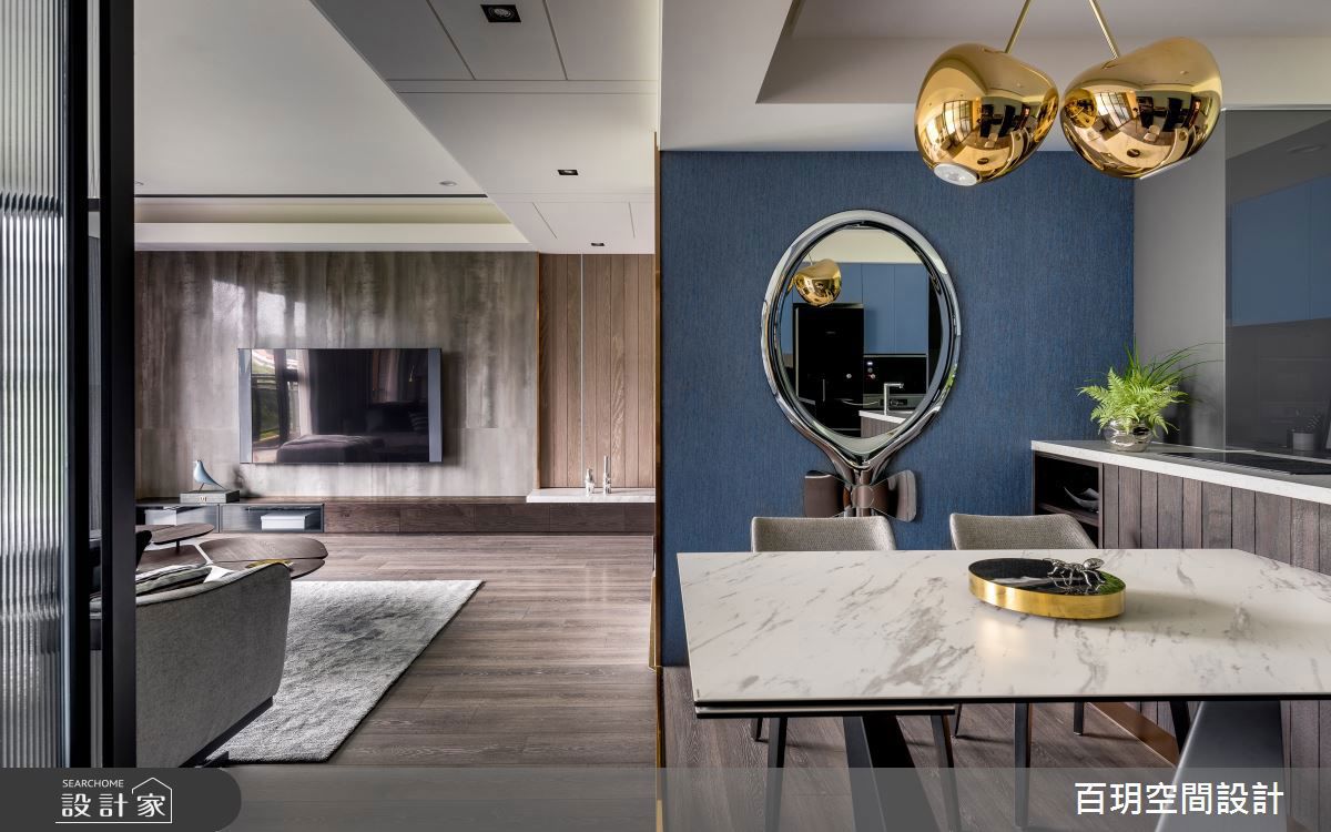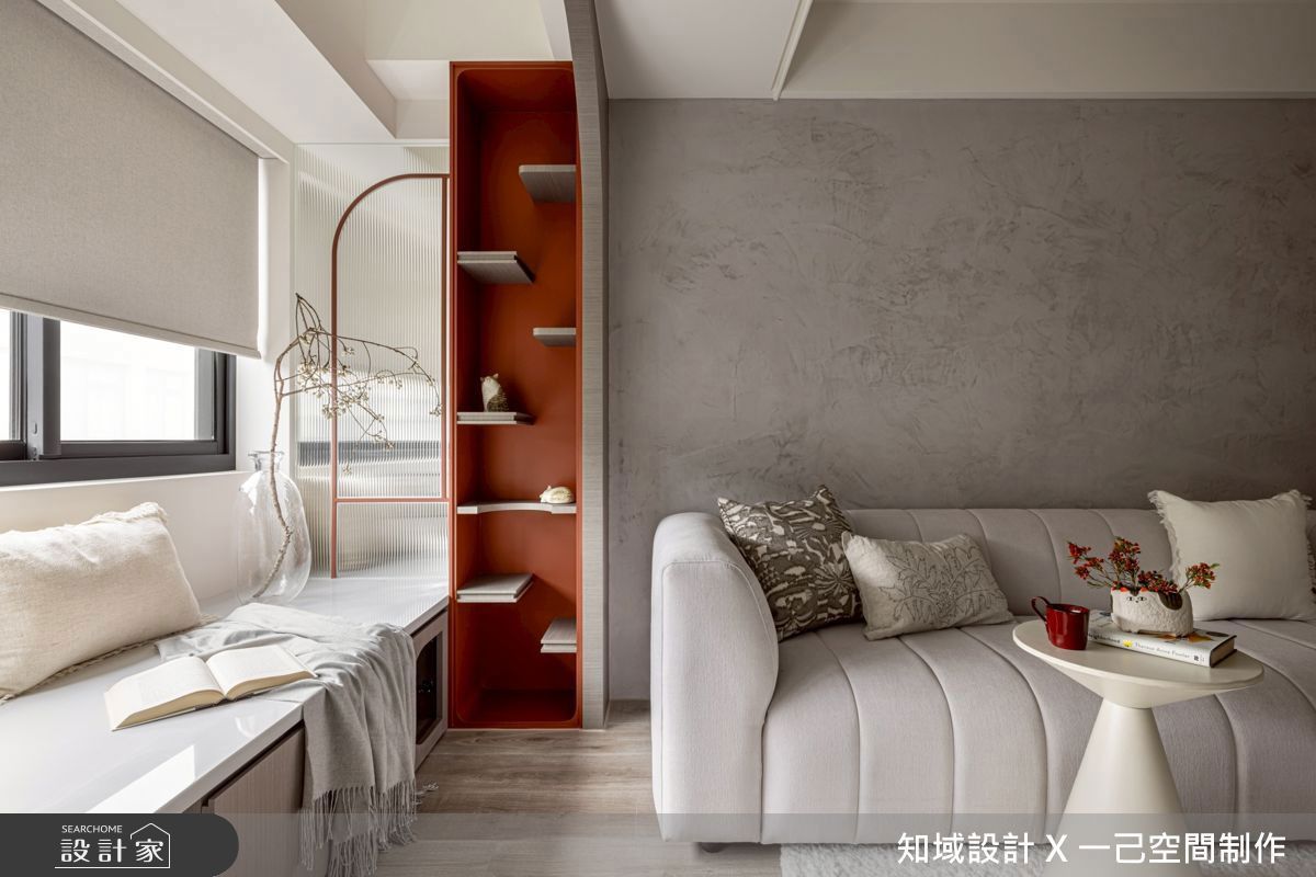 為補足採光,釋出一間臥室,並調整廚房隔間,以開放式設計打造複合書房的公共空間,串連起餐廚區域,使得視線加以延伸,讓日光能均等灑落室內。以沙發背牆確立和書房的分界,保留家人之間對話的空間,選用同款的白色石紋磚打造客廳主牆、廚房,適時以跳色家飾,在自然簡單的氛圍中,注入一股新生活力。運用灰白相間的幾何地坪,確立廚房區域,搭配高腳椅的中島餐桌,既可作為用餐時的對話空間,更彈性地擴充備餐區,為夫妻倆營造機能性十足的溫馨居家。