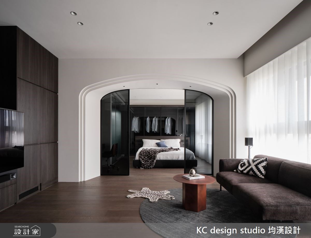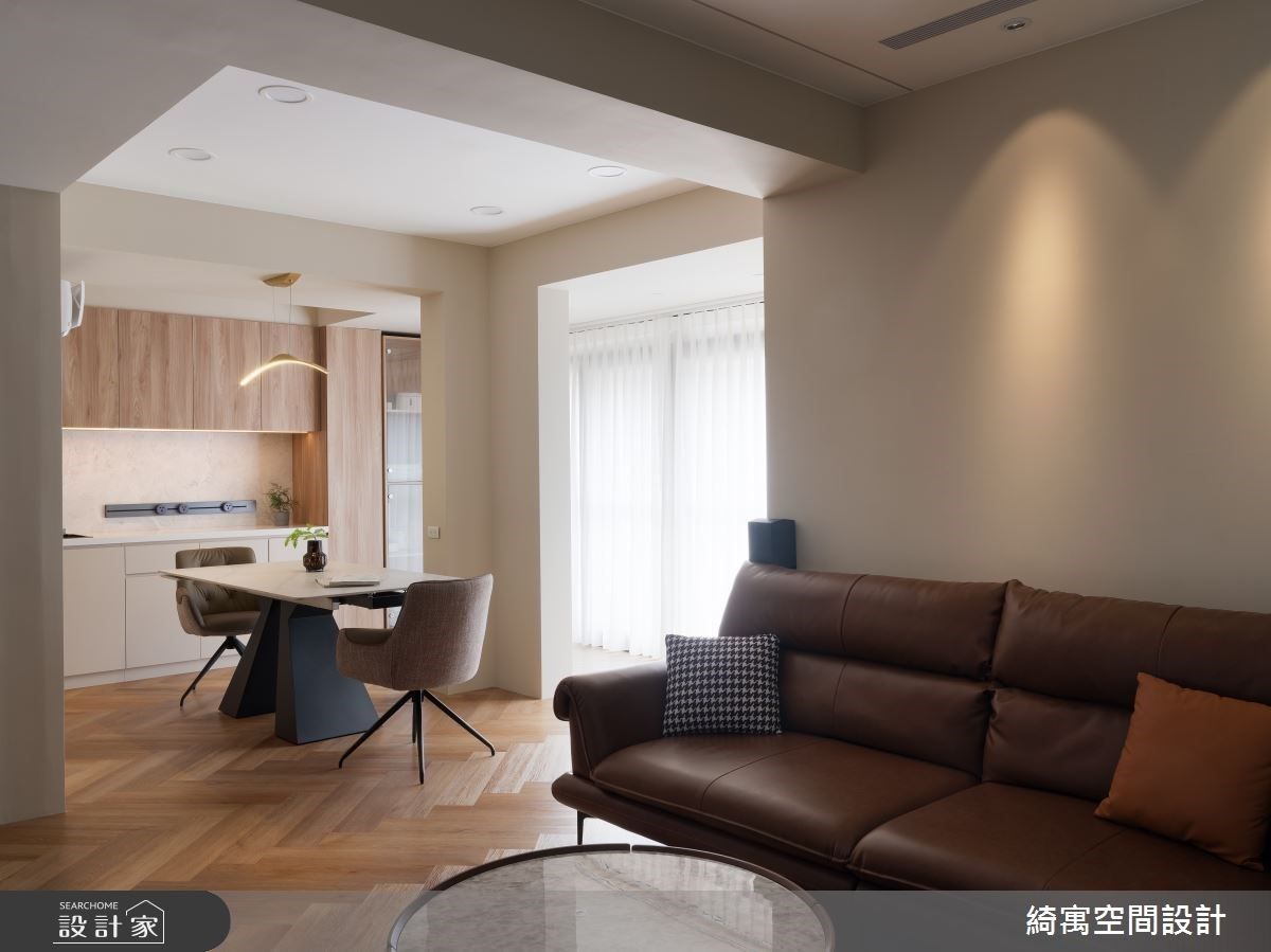 這個28坪的家,屋主夫妻希望能擁有通透明亮室內輪廓,因此在格局配置上,設計師讓開放式的客、餐廚與書房分別至於空間的兩端、彼此對望,讓公共區域得以串聯、空氣流通,同時增加空間的深度。天地壁的設計上,純粹不複雜,鋪上復古色彩的人字拼木地板,創造視覺變化及環境溫度,橫亙天花的大斜樑,經過精密的計算,略為壓低並包覆後,與大理石電視牆、機櫃、冰箱和黑鐵鏤空展示櫃結合,無形之隔、化解建築既有的缺憾、少了實牆的限制,卻也定義客廳與餐廚區域,讓居住者優游其中,享受時刻美好。
