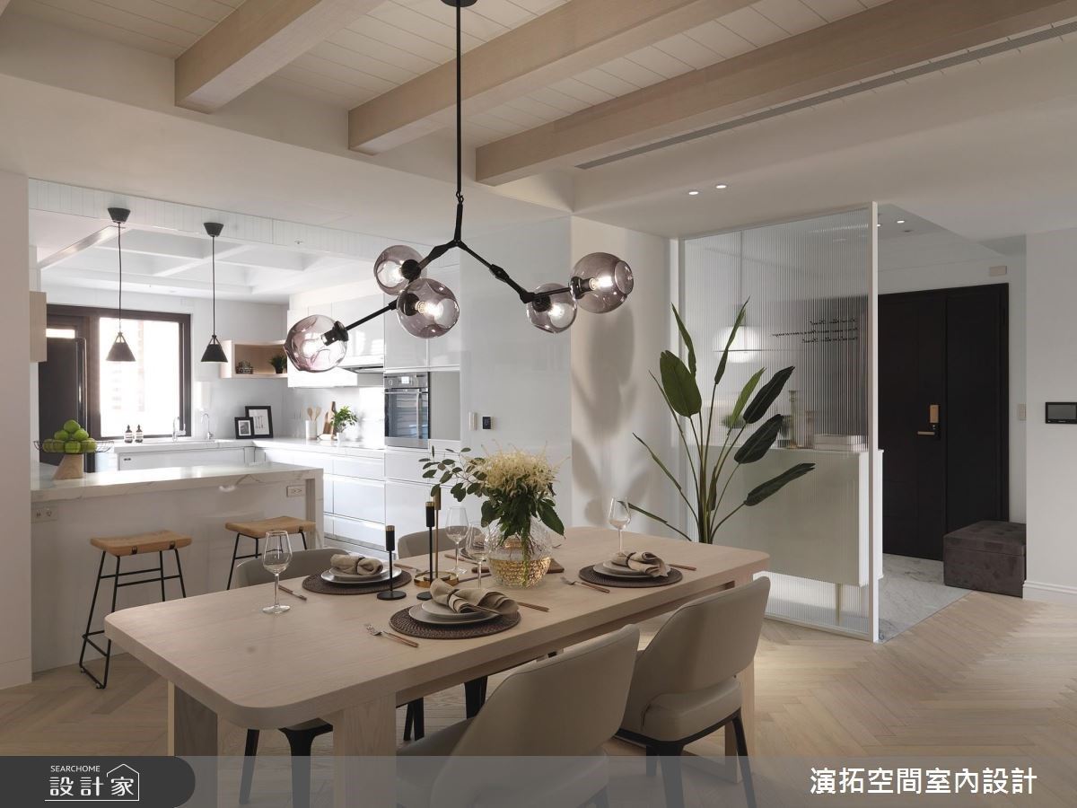 將玄關的花磚廊道感引進廚房,雙邊對稱的上下櫃以線板流逸輕美式。寢臥也在蒂芬尼藍或淺綠的大牆,以線板跳色框出雅緻恬靜的表情,醞釀好夢空間;其中的主臥壁紙以輕描牡丹添抹東方情愫,女兒房則如青春少女住進公主的夢幻城堡。