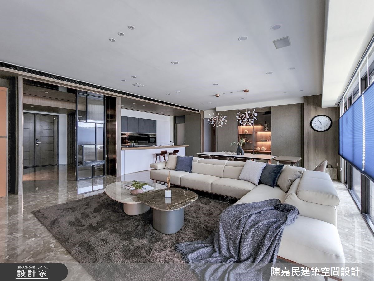 將中島輕食區和客廳錯位之後,一面沿大牆而設的拉門,便可因應不同場域,切割相應的收納機能,從左至右隱藏紅酒櫃、電視和書櫃,讓偌大比例的接待區更顯美酒、美食與好書相伴的暢懷共享。且不忘巧妙串連藍色的小起居室,無形圍塑孩子的歡鬧角落;大人小孩各得其樂又互通聲息,玩美實踐屋主對家的夢想。