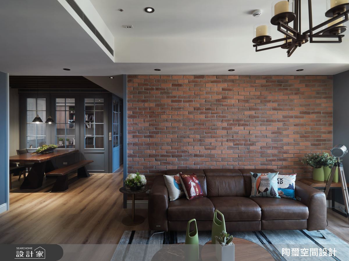 在一片大地色之中,把屋主喜歡的藍和綠化身為家具軟件,活化空間氣息。女主人喜歡的東方語彙,也藉沙發背牆灰藍的仙鶴壁紙,和陽台的植栽綠意,一起搭襯出自然愉悅的情調,尤其落地窗不以紗簾而以木百葉的巧思,更添鄉村情懷。
