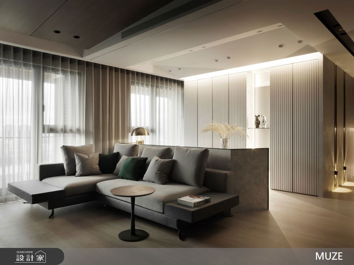 入室後的玄關,右側大地色系的鞋櫃利用鏡面鋪設腰帶造型,打破規矩的視覺感受,注入新穎多變;正面則利用茶鏡鋪設的端景及穿透感玻璃屏隔,巧妙界定內外領域,且讓玄關空間更顯完整。客廳電視牆以潑墨山水美感的大理石材鋪陳,大面積加上深色基底,帶來壯闊器度,且與白色為基底、淡雅紋理的沙發背牆相互對話、互襯,搭佐大地色系的弧形茶几、壁面與灰色布料沙發,傾入溫潤、自然的安定氣息,融化石材營造的冷冽氛圍。電視牆後方、以玻璃門隔出書房區,兩側分別以木作書桌與鋼琴擺設,上方高度納入層板書架,強化收納機能,直達窗邊臥榻區,閱讀或是練琴累了,隨時都能休憩一會兒。