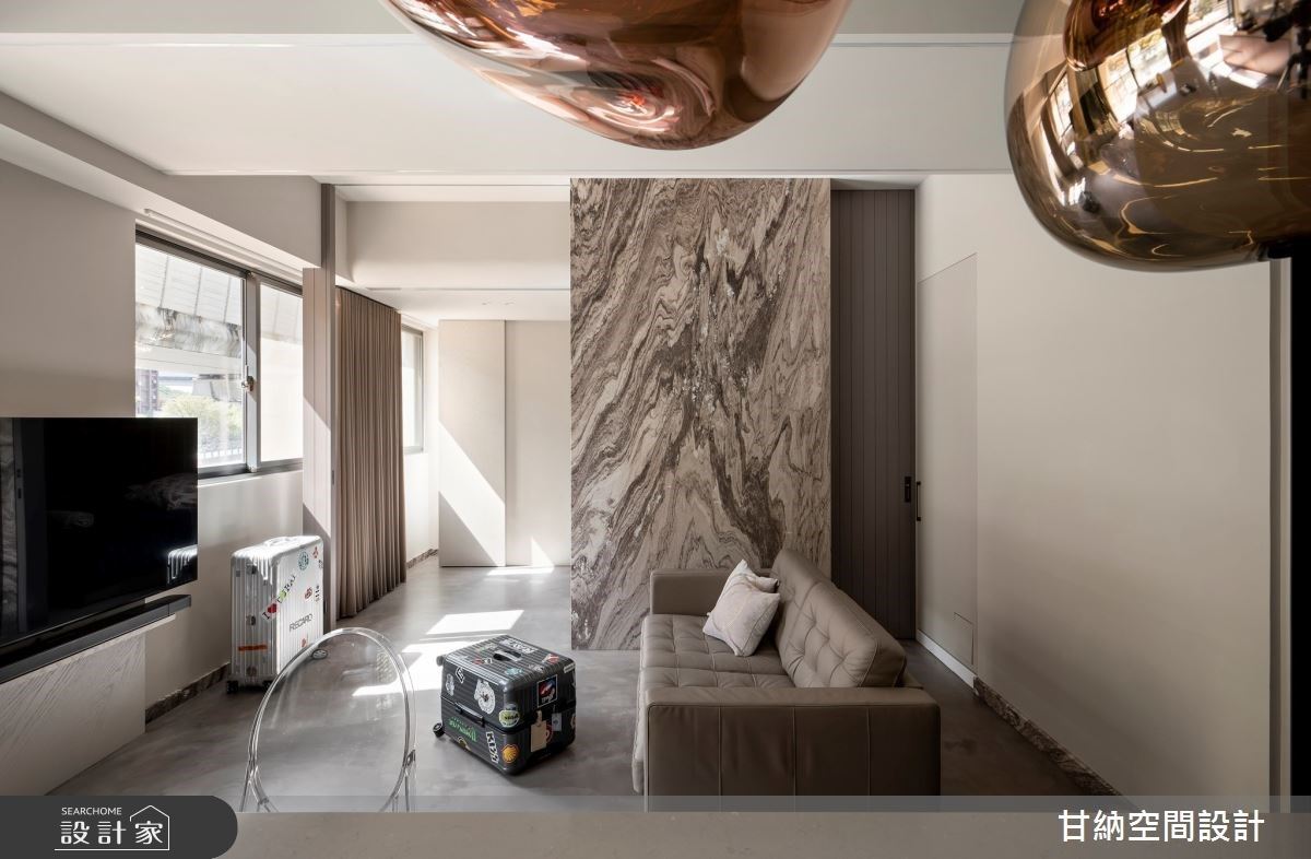主臥色系選用杏色主牆營造紓壓有氣質的私領域環境,收納櫃選用深咖啡係延續沉穩生活感,並製造大容量收納櫃隱身於壁面的視覺效果。針對女屋主期望的精品包收納展示空間與男屋主想要的收看電視,設計師巧妙整合置收納櫃內,創造美觀、好動線、高機能的完美設計。