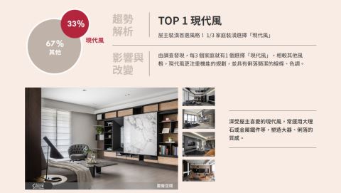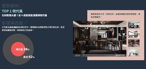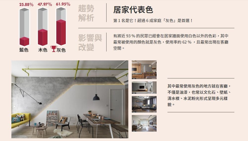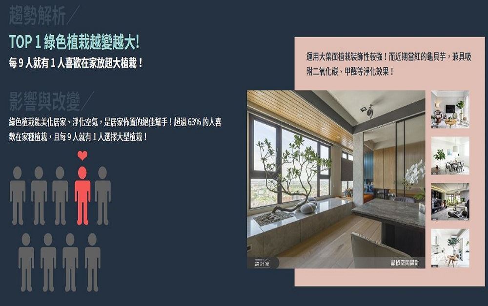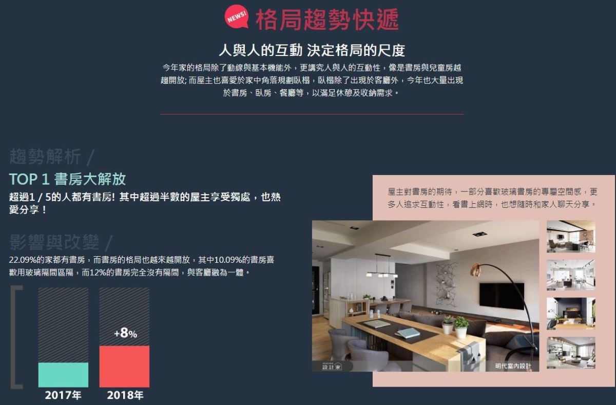台灣室內設計、裝潢社群平台「設計家 Searchome」網站發表「2020 年度室內設計潮流趨勢報告」,包含今年已連續第三年推出台灣居家裝潢趨勢研究,今年根據站上超過 1,700 筆案例與 2 萬張圖的大數據作為年度趨勢報告資料來源。設計家 Searchome網站經理楊秉寰表示,有別於往年著重數據上的解構、重組與整理,今年特以生活角度加入研究過程,除了色彩美學、家居元素、風格潮流三大分類之外,全新類別「生活提案 Living」便是針對台灣人民生活的時代環境、社會現象與科技文化作為分析基準點,期盼運用寬廣深遠的格局視野,剖析未來台灣居家裝潢趨勢;畢竟室內設計與居家裝潢以人為本,會根據人的生活型態而有所變化、變遷,最後成為生活動線的「解決方案」。