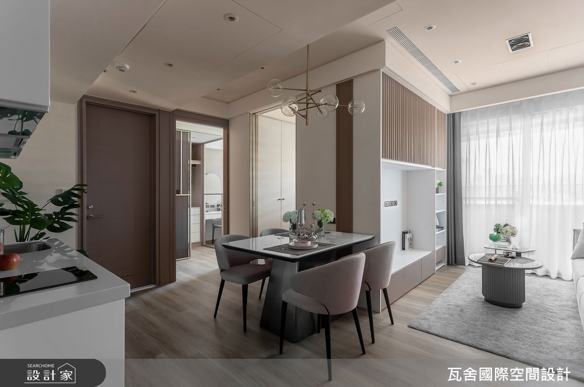 深色木紋、帶有灰黑紋理的石材為基礎下,替公領域打造出沉穩舒適感,局部利用金屬、銅條、茶鏡材質的點綴,提升視覺亮度,像是電視牆以大理石打造,表面嵌入些許銅條,大器之中挹注華麗感。玄關與走廊的地坪使用磁磚,一路延伸到廊道盡頭,創造和諧的視覺力道,與公領域的深色木紋做為鮮明劃分;餐廳上方巧遇大樑,透過鍍鈦材質的包覆,美化結構且與室內的精緻材質相互呼應,帶來放大視感;木紋餐桌與石材中島的安排,成為銜接客廳與書房的中繼站。