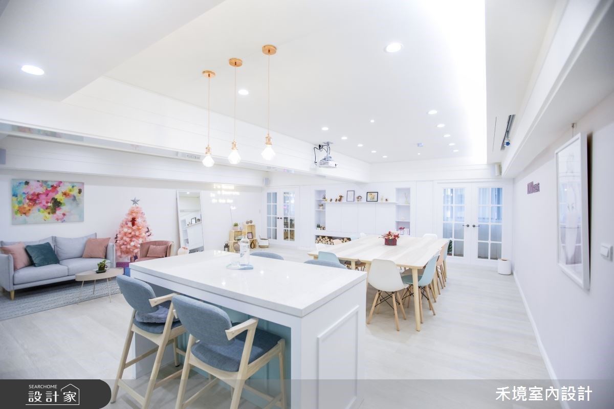 有著不規則格局的樓中樓空間,透過延展的動線擘劃,包圍公共場域的緊密關係,讓家人可在空間內對話、聯繫情感,且加入不刻意界定的開放式串聯,以及穿透式隔間設定,讓互動情境更為親密,從天花板垂墜而下的吊燈,則呈現特殊的裝飾與照明機能,為室內營造更挑高的感受;窗邊因鄰著良好採光,增設了一區休憩臥榻,使空間更能靈活運用,整體藉由大面窗將日光引導入內,使光線連結每個區塊,形塑日常的美好;色彩搭配上,透過靜謐純白為基底,搭配溫煦木質地板,營造簡約素雅的背景,馬卡龍的粉色家具則增加活潑度與層次感,讓空間柔美得宛如一件藝術品!