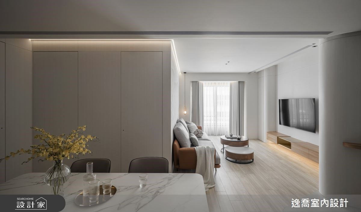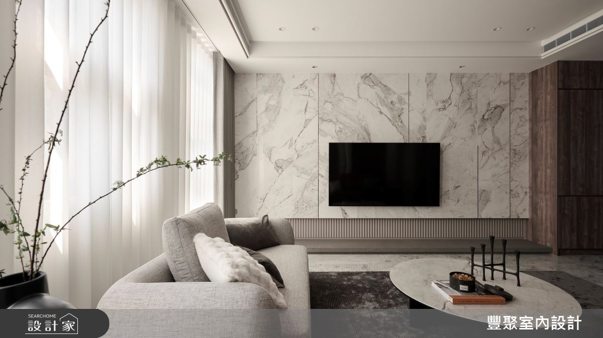 設計師微調格局就優化空間、化解新成屋內的種種風水疑慮外,風格形塑上透過精緻的進口薄板磚搭配溫潤木格柵。一家三口不論是待在客廳沙發還是陽光臥榻,於外能欣賞窗外公園綠景,對內則看到溫潤木格柵與雪白銀狐磚建構出屋內的美麗端景。