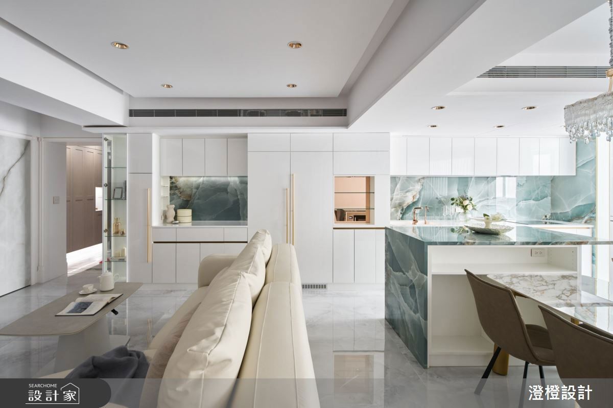 設計師把原本書房的隔間拆除,改以半高的卡拉拉白大理石電視牆,劃分出客廳及書房的界線,並且利用窗邊臥榻串聯兩個空間,陽光可以沿著臥榻照亮整個公領域,拿本書或放空沉思都相當閒適。書房除了鐵件與木質搭配的書牆外,還兼具琴房使用,未來孩子可以伴隨著琴音成長。餐廚空間設置能夠招待賓客的備餐吧台,高起的設計化解開門見灶的風水疑慮,成為室內的亮點之一。