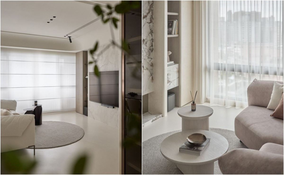 舨舍空間設計刻意以淺色為底,純白、淺灰、米褐色調等實境,對比出不鏽鋼立燈、餐桌的玻璃、廚房黑鏡的輕盈虛景,再援引窗外綠意水池與暖木入室,透過反射性材質詮釋出透天豪宅的開闊通透氣氛,除了黑白對比,鏡面的應用使居家場域多了虛實融入、內外交疊、介質轉換的設計巧思,優雅呈現客餐廳空間的異材質風情,草木、水意、鏡光、白韻,交相層疊出多元材質的優雅詩意。