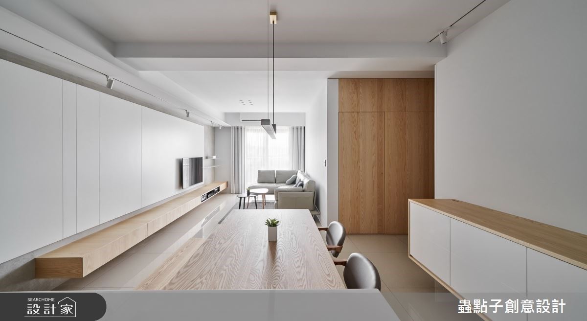 空間、預算有限的女子宅規劃中,設計師選以輕暖木與純白色,鋪陳輕鬆與優雅氛圍。滿足了充足收納規劃後,原陽台位置改為簡單的開放式廚房,利用吧台餐桌的設計連結客廳,讓公共空間整合為一,視野放大並共享窗外河岸公園的美好光景;此外,為妥善利用屋況優勢,設計師將吧台式餐桌檯面高度調整至欣賞窗外風景的最佳視角,同時兼顧小吧台、廚房備餐檯與書桌多重機能。步入二樓前,樓梯旁的採光充沛的窗邊處,原為老屋的陽台領域範圍,純白的色調安排、切齊樓梯面與擴充格局的設計,打造出放鬆的臥榻與實用的曬衣機能,成為獨處、放空、閱覽的休憩角落。