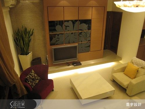 順著自然光線做空間佈局,將客餐廳安排在採光最好的位置,電視牆採弧形設計化解窄長空間的壓迫感;流動切線比擬迷人的市景天際線,牆上的特殊塗料隨日照變化框出家的各種表情。順著電視牆律動將焦點轉移到輕盈的中島設計,牆面內凹結構設定為女屋主杯具的展示收藏架,懸浮清透的陳列且方便拿取。色彩作為中島與廚具的橋樑,透過天藍色調的渲染令廚具大放異彩,混搭法式線板創造雲朵般輕柔浪漫的古典設計。距離採光窗最遠的玄關區整合了公共區域的收納機能,並利用鏡面設計替玄關爭取更充沛的光源與空間感;而透過微調廚房位置後,玄關鏡面後方隱藏了完整個儲藏室用來收納電器、行李箱等大型家具與家電,將小宅坪效發會到極致。
