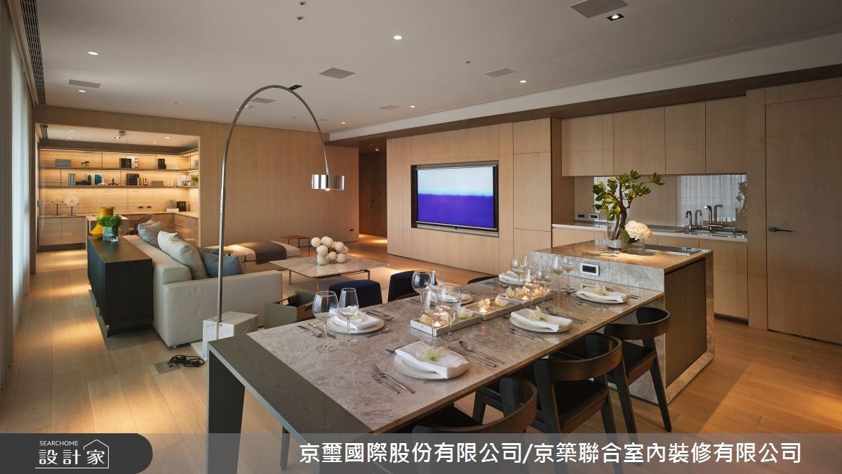 餐廚區兩側電器櫃選用黑色門片隱藏收納,延續深木色牆面,帶來一致且對稱的空間感;採光通透的廚房,透過霧面玻璃門傳遞光影至餐桌領域,置中的卡拉拉白大理石餐桌,搭配個性鮮明的鐵鏽吊燈,跳脫整室木質色調成為視覺焦點,燈具內裡微微透出的金色與廚具的不鏽鋼呼應著,展現用餐時獨有的寧靜與時髦享受。