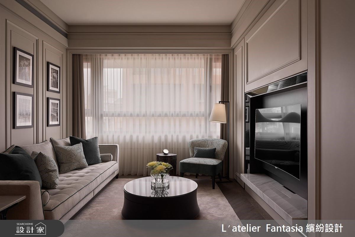 客廳電視牆以大理石美耐板鋪排,再搭以鍍鈦金屬邊條勾勒,簡約大方卻不單調,並一路鋪滿兩道牆面創造視覺延伸感,奠定不造作的輕奢現代風格。此外,屋主是位烘焙高手,也重視收納容量,原有建商配置的廚房格局,無法滿足屋主烘焙器具的收納,因此設計師運用玻璃拉門取代原有的隔間牆,空間打開後視線明亮許多,在廚房烘焙能保持與客廳的交流與互動,不規則中島吧台的加入,也豐富了用餐的趣味與氣氛。電視牆旁的書房領域,也以玻璃拉門的概念替室內帶來更充裕的採光,並強化空間之間的連結性;好客的女屋主時常有訪客,關上門片拉下簾幕,也能成為親友的過夜客房,具備多重且彈性的使用機能。