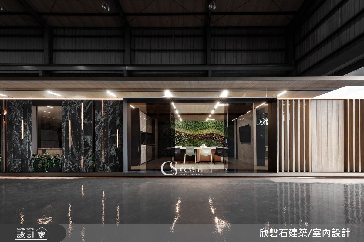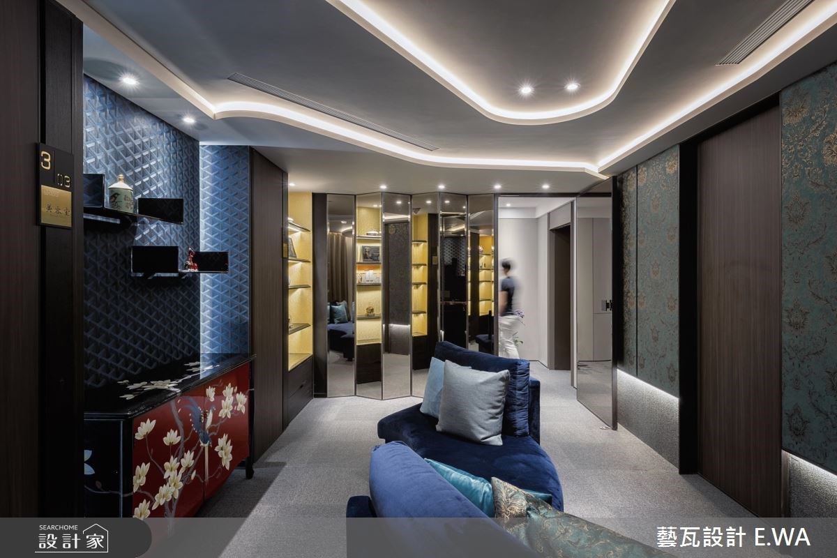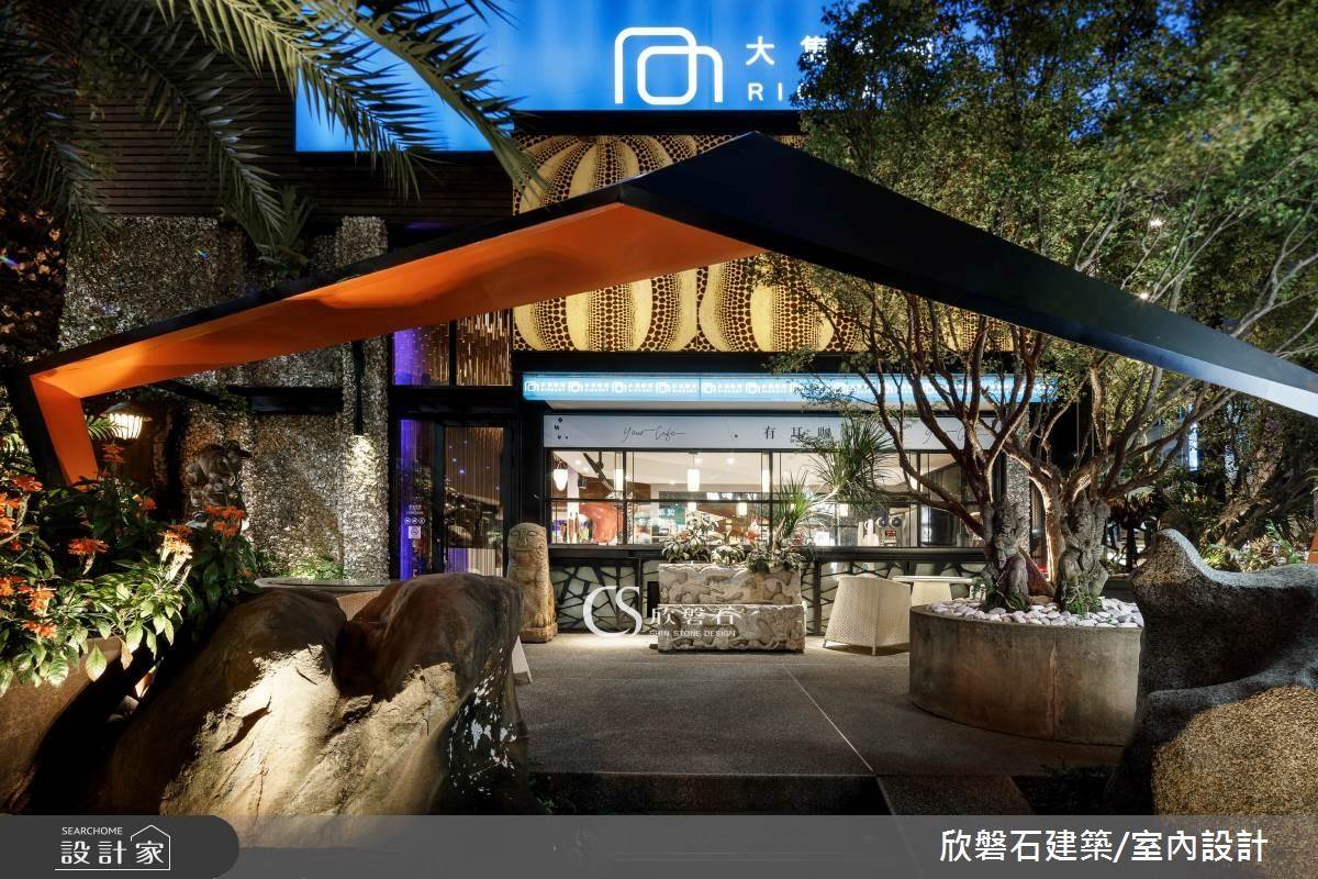 一樓餐飲,規劃半圓拱門玄關引導動線,搭配數位電子螢幕營造水瀑意象,形成迎賓的美好風景,以藍白色象徵水流,讓顧客在室內也猶如置身自然美景之中;格局上,則藉由挑空天花與大面積落地窗,營造壯闊大器的氛圍,規劃弧形天花延伸出至頂部開展成獨特造型;空間隔屏採藏青色為基底,加入金屬飾條、隱藏LED燈帶包覆,華貴且低奢,藉由錯落配置劃出長條形的類動線廊道,適時為大尺度空間區分出左右兩個用餐區塊,與垂墜的金色金屬簾、圓形鏡面、鏤空板的幾何造型光暈,共構出具儀式感的視覺主軸!