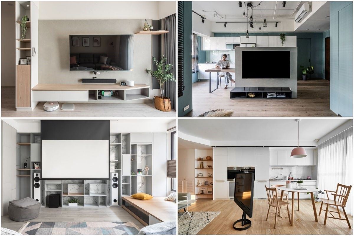 半高電視牆最大的優勢就是雙面都能賦予機能!有別於將電視安置於空間內原始牆面,由設計師規劃的半高電視牆能更準確的劃分客廳與其他場域。作為客廳電視牆一面可懸掛電視加電器收納,另一面隨著場域不同,有些會規劃成餐櫃收納、書牆收納,也有的直接連接打造中島吧台,或是安裝另一台電視。半高電視牆在造型上與材質上也很多選擇,大理石鑲嵌鍍鈦金屬、木作烤漆或是加入鐵件造型,收納的呈現從開放式格狀櫃、洞洞板、抽屜櫃、門片櫃等等都有,也可以單純當作展示牆,兼具功能與美觀的設計讓半高電視牆成為近年電視牆設計主流。