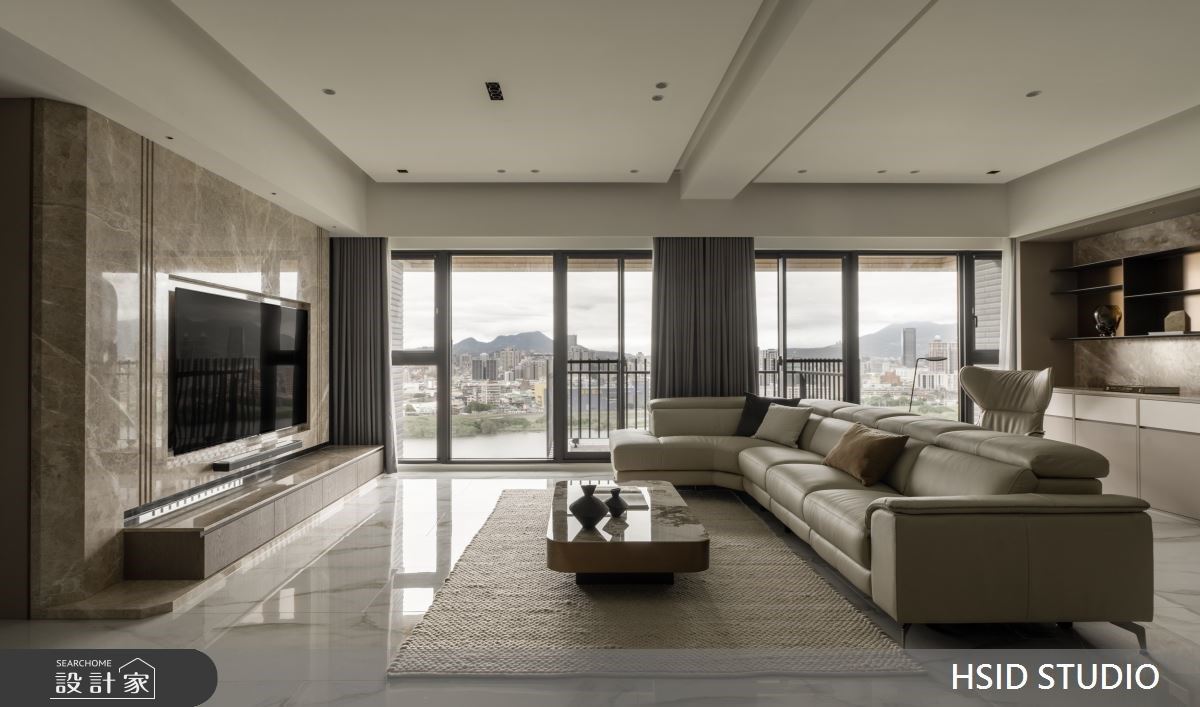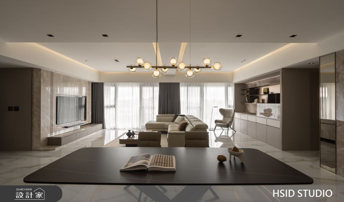 展示櫃則結合收納機能,加入線性光源,使空間更加立體,櫃體後方選用灰鏡,使視覺感延伸,客廳與休憩區的圓弧型天花板加入間接式光源,讓空間更有層次及設計感,運用的得宜的燈光美學,燈光依稀勾勒出屋主的生活型態,讓日子更加璀璨多變。